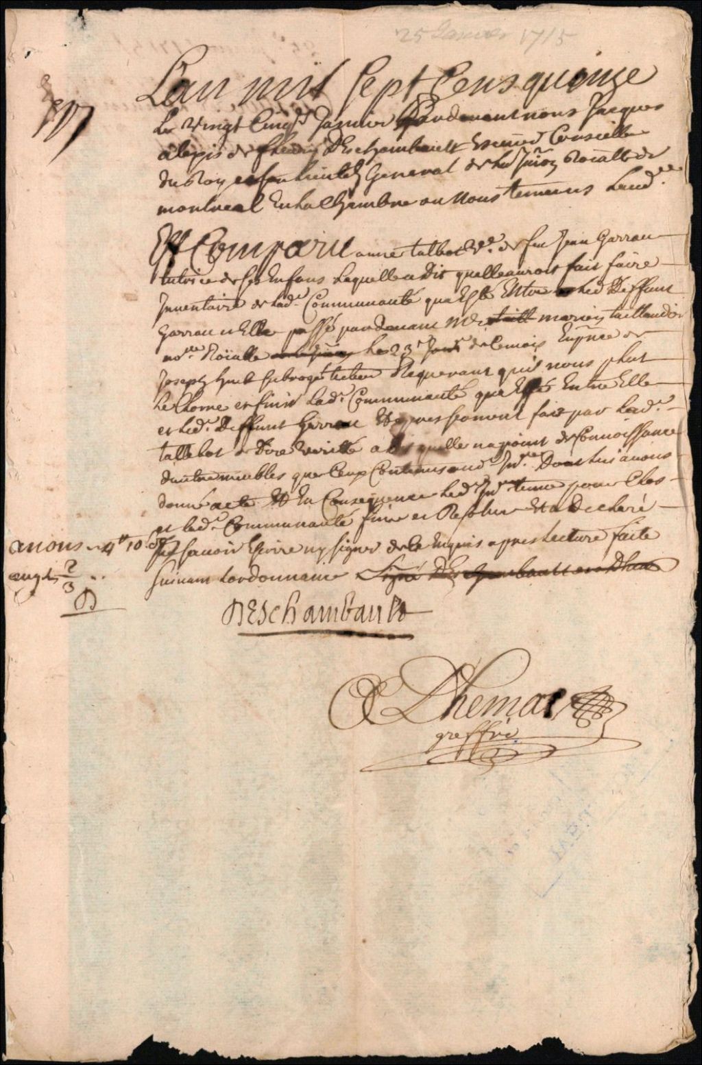 Clôture d'inventaire des biens de la succession et de la communauté d'Anne Talbot et de défunt Jean Gareau [dit St-Onge], 25 janvier 1715, Archives nationales à Montréal, Clôtures d'inventaires. District judiciaire de Montréal, (06M,CV601,S1,D21).
