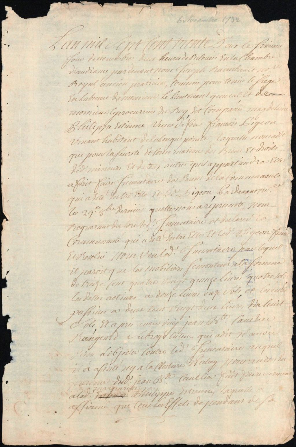 Clôture d'inventaire des biens de la succession et de la communauté de Madeleine Philippe Étienne et de défunt François Pigeon, 6 novembre 1732, Archives nationales à Montréal, Clôtures d'inventaires. District judiciaire de Montréal, (06M,CV601,S1,D216).