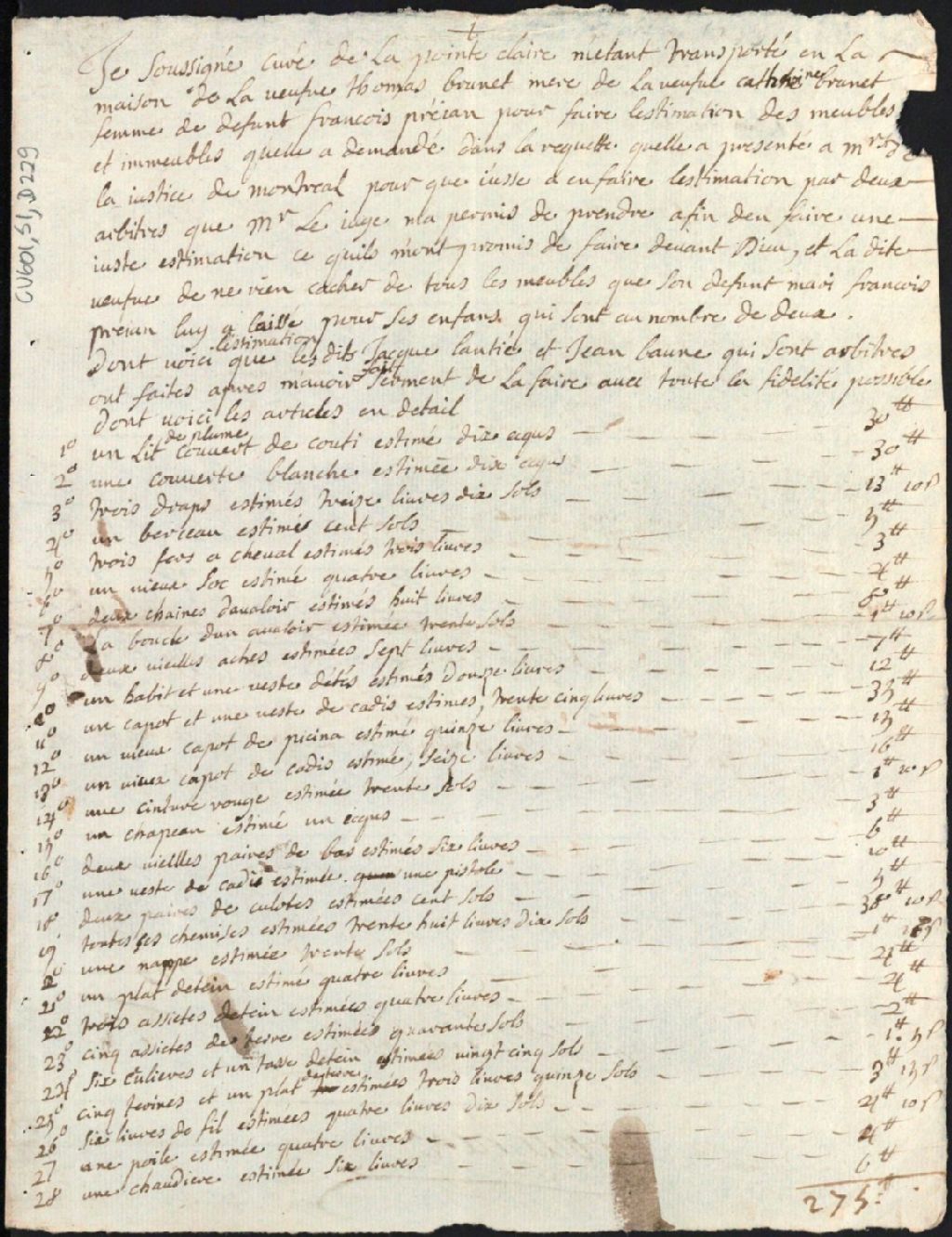 Inventaire et clôture d'inventaire des biens de la succession et de la communauté de Catherine Brunet et de défunt François Préjan [Prégent dit L'Oeillet], 2 mai 1733, Archives nationales à Montréal, Clôtures d'inventaires. District judiciaire de Montréal, (06M,CV601,S1,D229).