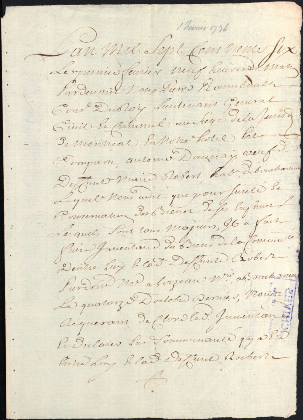 Clôture de l'inventaire des biens de la communauté d'Antoine Doumay [Daunais dit Lafrenière] et de défunte Marie Robert [dit Fontaine], 1 février 1736, Archives nationales à Montréal, Fonds Cour supérieure. District judiciaire de Montréal. Clôtures d'inventaires, (06M,CV601,S1,D313).