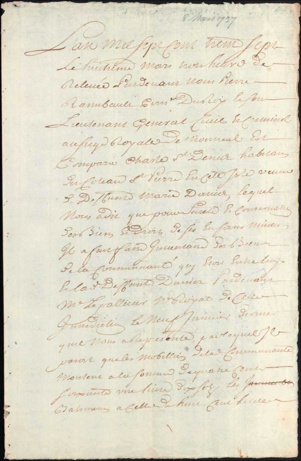 Clôture d'inventaire des biens de la succession et de la communauté de Charles Saint-Denis et de défunte Marie Danis [dit Tourangeau], 8 mars 1737, Archives nationales à Montréal, Clôtures d'inventaires. District judiciaire de Montréal, (06M,CV601,S1,D334).