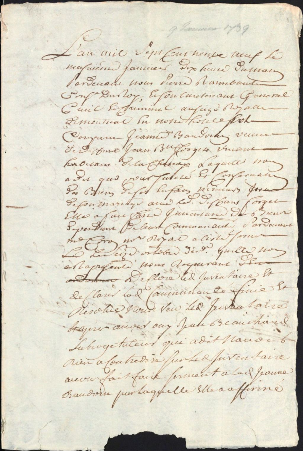 Clôture d'inventaire des biens de la succession et de la communauté de défunt Jean-Baptiste Forget et de Jeanne Baudoin, 9 janvier 1739, Archives nationales à Montréal, Clôtures d'inventaires. District judiciaire de Montréal, (06M,CV601,S1,D367).