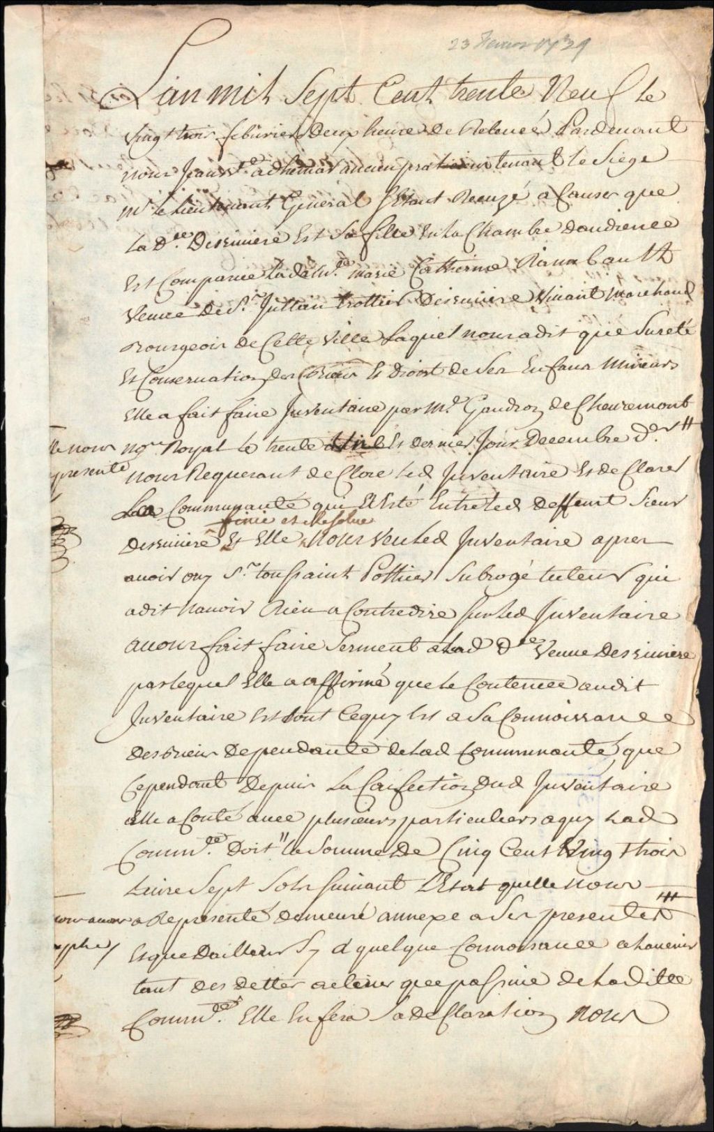 Clôture d'inventaire des biens de la succession et de la communauté de défunt Julien Trottier Desrivières et de Marie Catherine Raimbault, 23 février 1739, Archives nationales à Montréal, Clôtures d'inventaires. District judiciaire de Montréal, (06M,CV601,S1,D373).