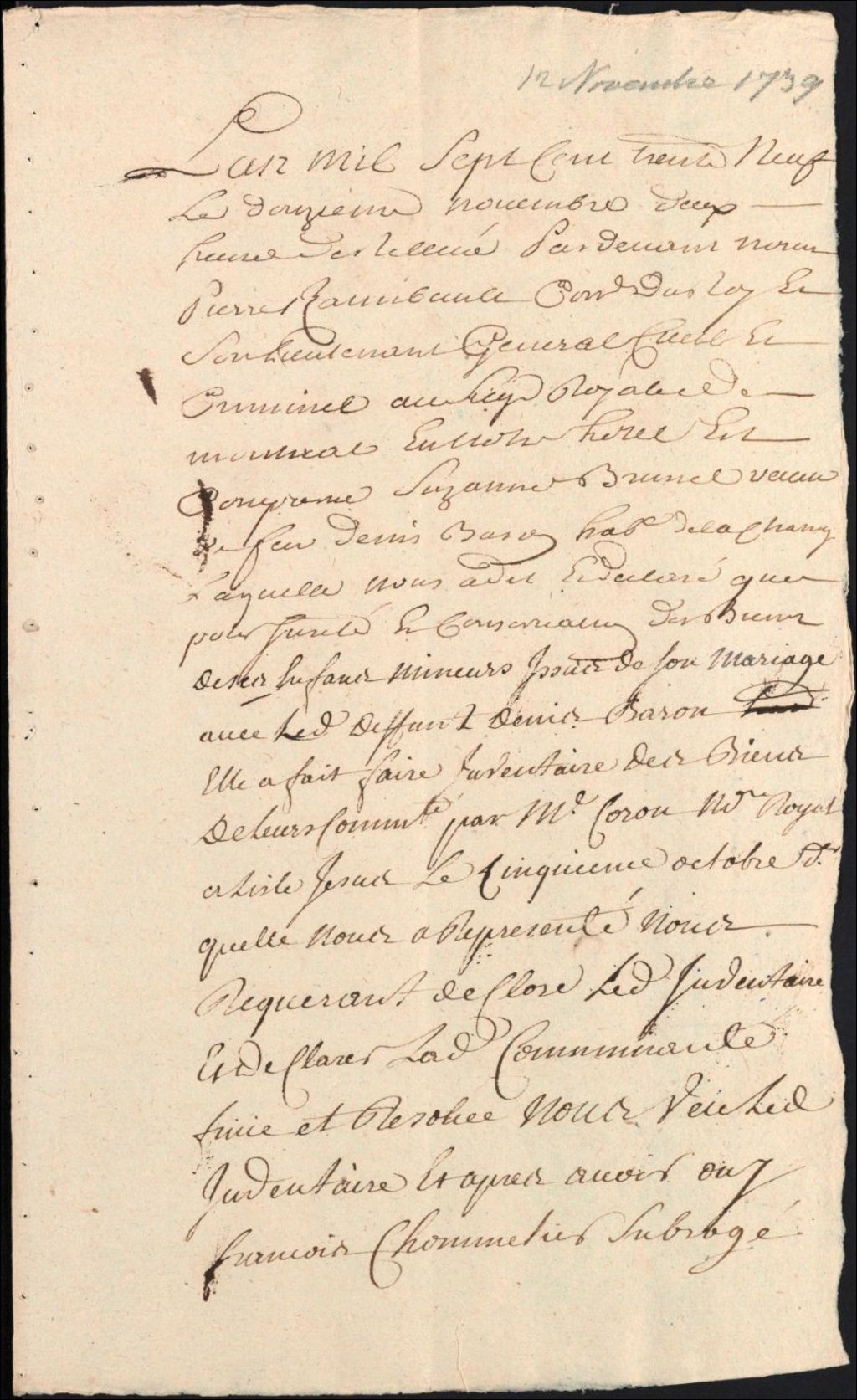 Clôture d'inventaire des biens de la succession et de la communauté de défunt Denis Baron et Suzanne Brunet, 12 novembre 1739, Archives nationales à Montréal, Clôtures d'inventaires. District judiciaire de Montréal, (06M,CV601,S1,D383).