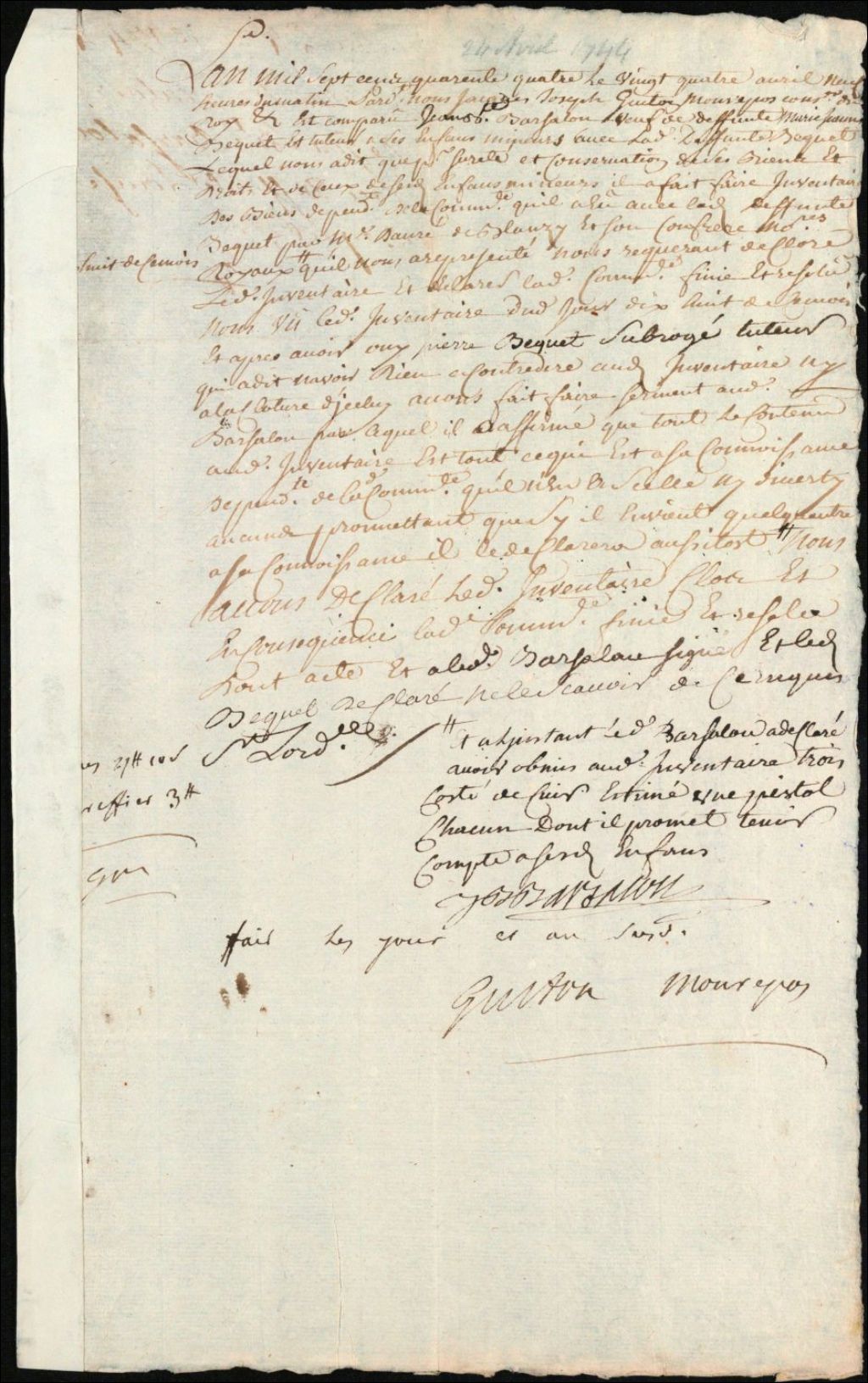Clôture d'inventaire des biens de la succession et de la communauté de défunte Louise [Marie Jeanne] Becquet et de Jean Baptiste Barsalou, 24 avril 1744, Archives nationales à Montréal, Clôtures d'inventaires. District judiciaire de Montréal, (06M,CV601,S1,D502).