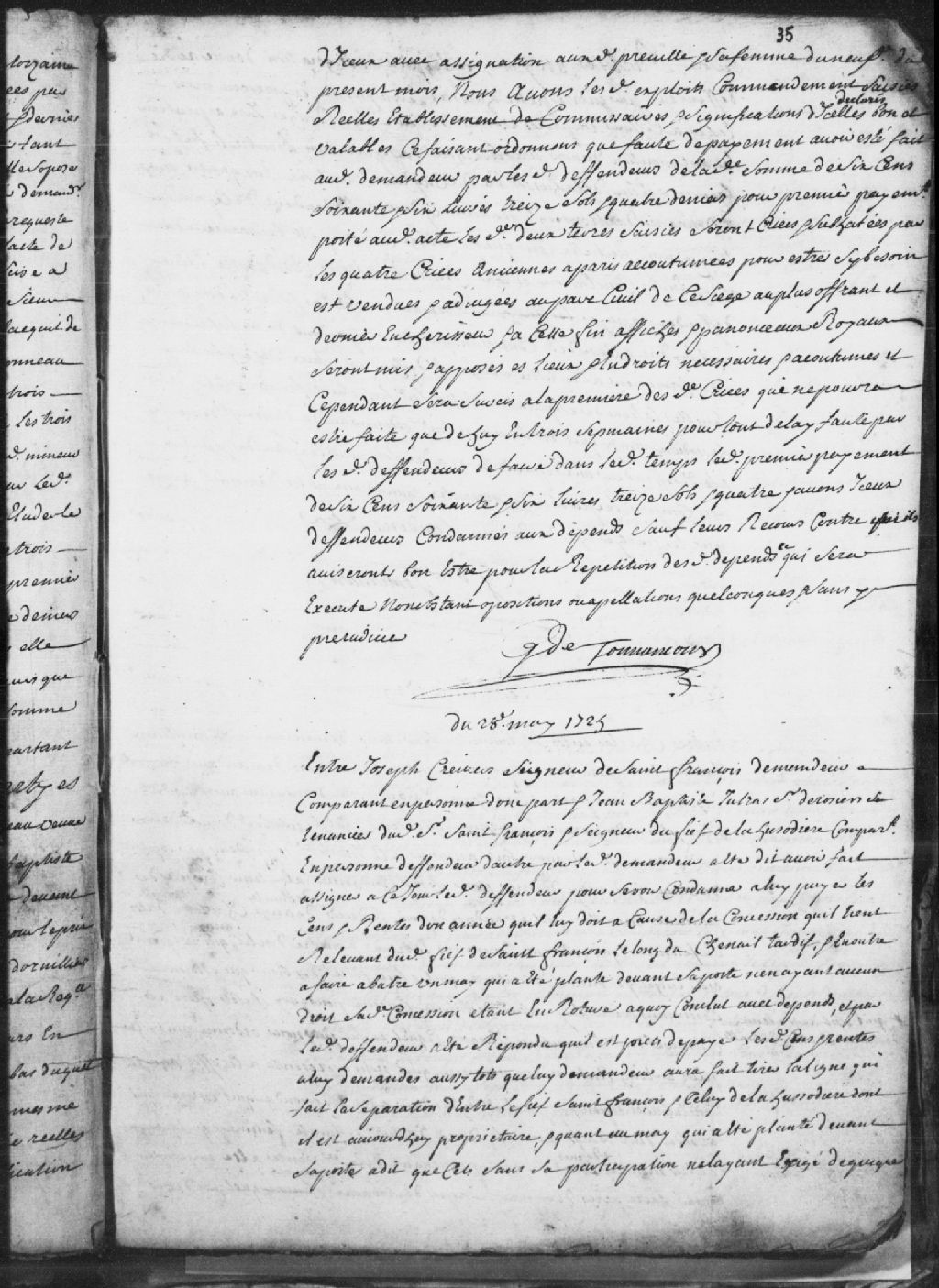- Le titre complet de la pièce se lit comme suit : Instance entre Joseph Crevier, sieur de Saint-François, demandeur, à l'encontre de Jean-Baptiste Jutras, sieur Desrosiers, tenancier dudit sieur de Saint-François et seigneur du fief de LaLussodière, défendeur. Ledit sieur de Saint-François veut que ledit Desrosiers soit condamné à lui verser l'équivalent d'une année de cens et rentes qu'il lui doit à cause de la concession qu'il tient relevant dudit fief de Saint-François le long du chenail Tardif et qu'il abatte un may qu'il a planté devant sa porte, n'ayant aucun droit sur sa concession. Ledit défendeur répond qu'il est prêt à lui verser lesdits cens et rentes dès que le demandeur aura fait tirer la ligne qui fait la séparation du fief de Saint-François de celui de LaLussodière dont il est aujourd'hui propriétaire. Quant au may qui a été planté devant sa porte, le défendeur affirme que cela a été fait sans sa participation, ne l'ayant exigé de qui que ce soit. Le sieur Desrosiers est condamné à verser les cens et rentes exigés dudit demandeur à cause de la concession qu'il tient dépendante de son fief. Ledit défendeur est également condamné à payer les dépens et pour ce qui est des autres demandes, les parties ont été mis hors cour.