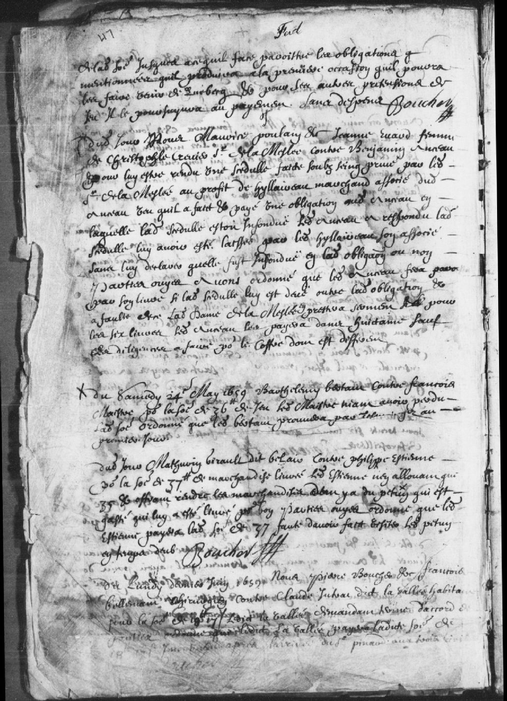 Requête de Mathurin Girault dit Belair (Bélair) contre Philippe Estienne (Étienne), pour la somme de 37 livres de marchandises livrées. Ledit Estienne ne voulant payer que 35 livres et rendre le pétun (tabac) gâté qui lui a été livré pour bon. Ordonné que ledit Estienne payera la somme de 37 livres pour n'avoir fait visiter le pétun en temps