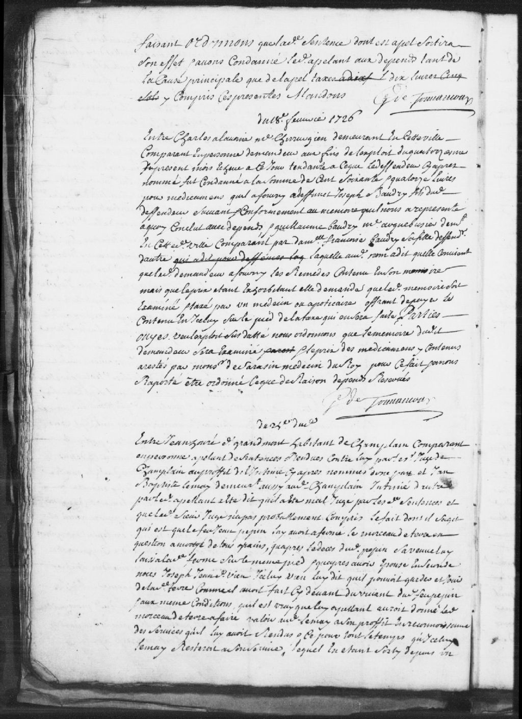 Appel d'une sentence par Jean Houray, sieur de Grandmont, habitant de Champlain, demandeur, à l'encontre de Jean-Baptiste Lemay, demeurant audit Champlain, défendeur..., 25 février 1726, Archives nationales à Trois-Rivières, Fonds Juridiction royale des Trois-Rivières, (04T,TL3,S11,P1131).