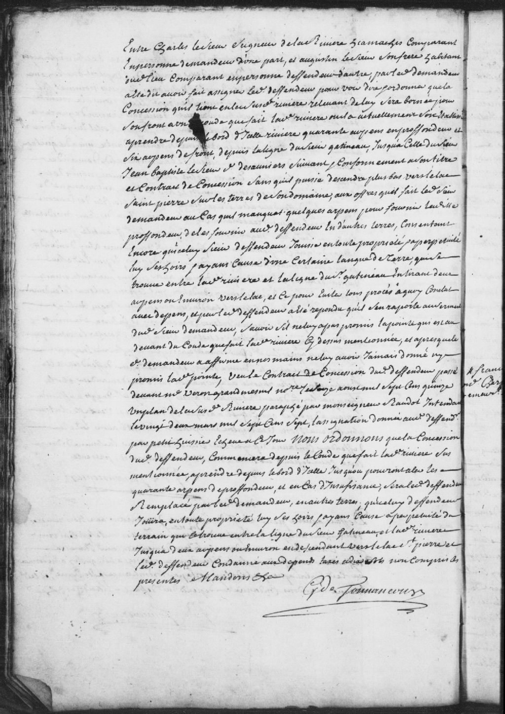Le titre complet de la pièce se lit comme suit : Requête de Charles Lesieur, seigneur de la Rivière Yamachiche, demandeur, à l'encontre de Augustin Lesieur, son frère, habitant à la Rivière Yamachiche, défendeur. Le demandeur réclame que la concession du défendeur soit bornée depuis le bord de la rivière, depuis la ligne du sieur Gatineau jusqu'à celle de Jean-Baptiste Lesieur dit Desaulniers (Desauniers) suivant son contrat de concession sans qu'il puisse aller plus bas vers le lac Saint-Pierre, sur les terres de son domaine. Le défendeur répond que ledit demandeur lui avait promis la pointe de terre devant le coude de ladite rivière, ce que nie ce dernier. Il est ordonné que la concession dudit défendeur commence à partir du coude de la rivière.