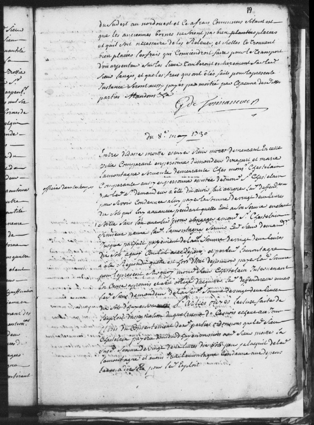Requête de Didace Moitte (Mouet, Moete), écuyer, sieur de Moras, demandeur, à l'encontre de Marie Lamontagne, servante demeurant chez monsieur Chastelain, assistée dudit Chastelain, défenderesse.., 8 mai 1730, Archives nationales à Trois-Rivières, Fonds Juridiction royale des Trois-Rivières, (04T,TL3,S11,P1231).
