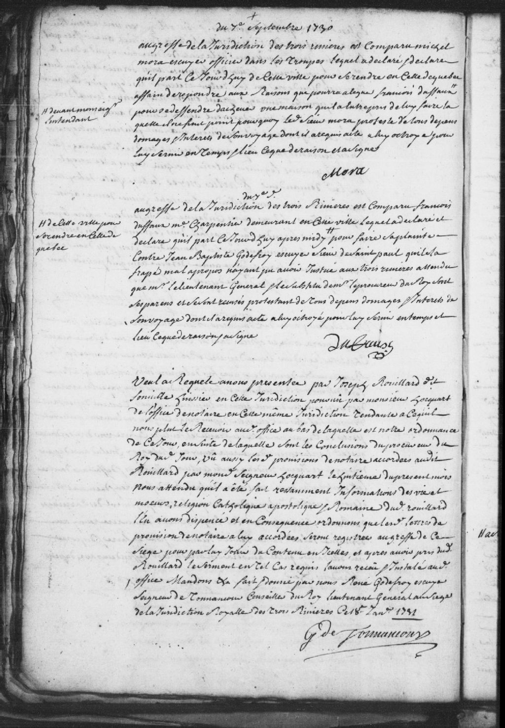Nomination de Joseph Rouillard dit Fonville (Fondville), huissier de la Juridiction de Trois-Rivières, pourvu par monsieur Hocquart de l'office de notaire en cette même juridiction. Il est ordonné que les lettres de provision de notaire lui soient accordées et elles seront registrées au greffe du siège de Trois-Rivières
