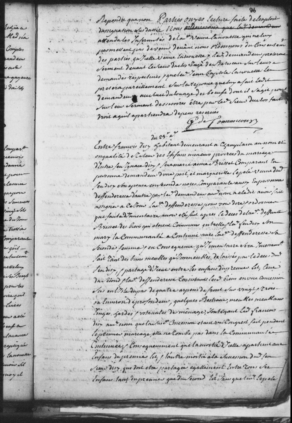 - Le titre complet de la pièce se lit comme suit : Requête de François Disy (Dizy), habitant demeurant à Champlain, au nom et en qualité de tuteur des enfants mineurs du mariage de feu Ignace Disy et feu Marie-Anne Brisset, demandeur, à l'encontre de Marguerite Lepelé (Lepellé), veuve dudit défunt Disy, son épouse en secondes noces, défenderesse. Le demandeur veut qu'un inventaire soit fait incessamment des biens délaissés par ledit feu Disy et que lesdits biens soient partagés entre les enfants du premier lit, ceux du second et ladite Lepelé. La concession de l'île Dupas, étant un conquêt fait pendant le premier mariage, ne doit pas tomber dans la communauté continuée et elle doit donc être séparée également entre les enfants du premier lit et ceux du second. La défenderesse répond qu'elle renonce à la communauté de biens d'entre elle et le feu Disy mais elle réclame le quart de la concession pour son douaire coutumier en plus de la somme de 200 livres à prendre en meubles. Il est ordonné que ladite défenderesse prenne un arpent de front de ladite concession pour son douaire coutumier et 200 livres en meubles pour son préciput. Le reste sera partagé de façon égale entre les enfants du premier lit et ceux du second.