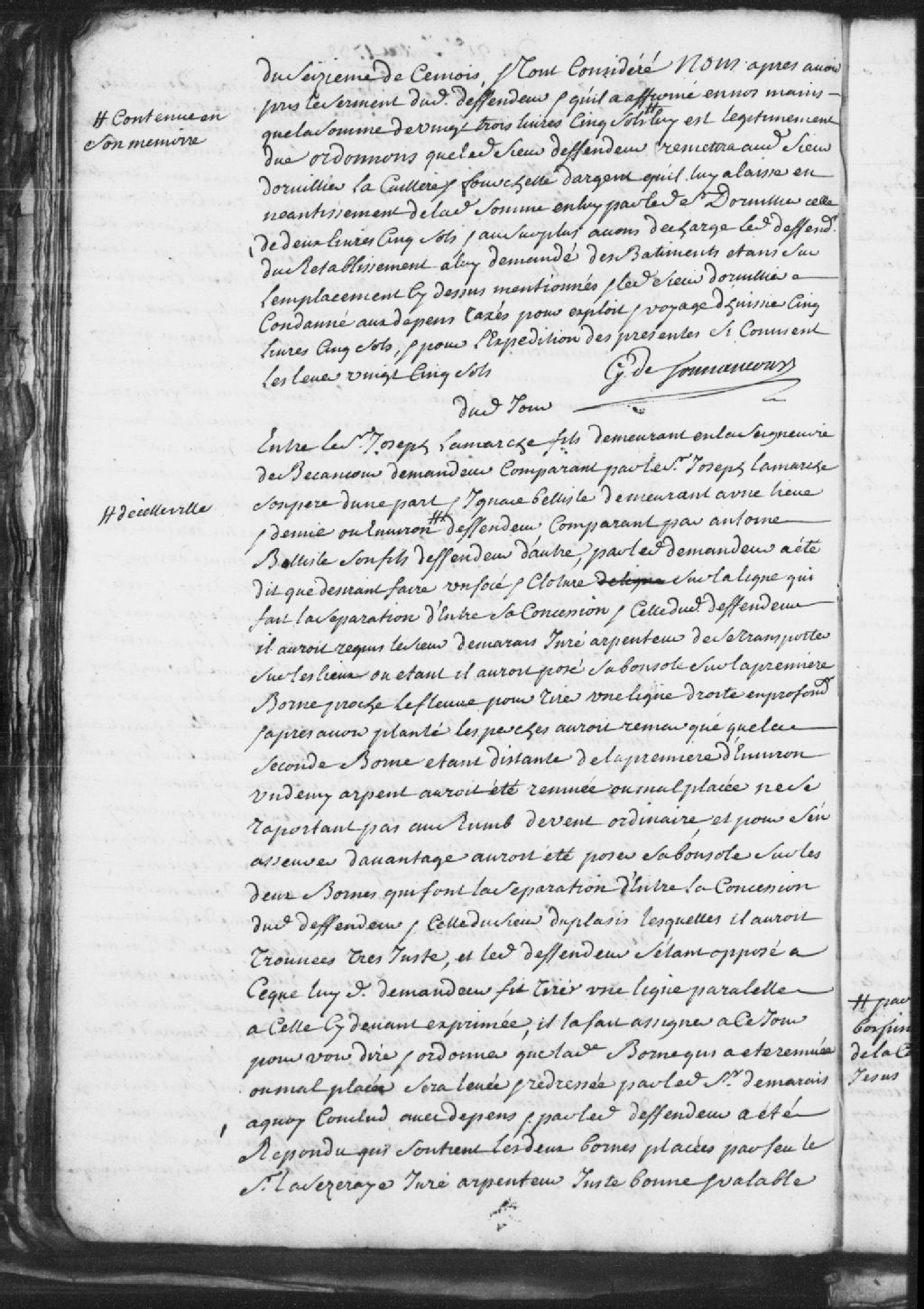 Le titre complet de la pièce se lit comme suit : Requête de Joseph Lamarche fils, demeurant en la seigneurie de Bécancour, comparaissant par Joseph Lamarche, son père, demandeur, à l'encontre de Ignace Bellisle (Belisle), demeurant à une lieue et demi de Trois-Rivières, comparaissant par Antoine Bellisle (Belisle), son fils, défendeur. Le demandeur a fait appel au sieur Desmarais, arpenteur, pour tirer une ligne droite en profondeur qui sépare sa concession de celle du défendeur, alors que ce dernier s'est aperçu que les bornes étaient mal placées comparativement à celles qui séparent la concession du défendeur de celle du sieur Duplessis, son autre voisin. Ledit Lamarche affirme que le défendeur s'est opposé à ce que l'arpenteur tire une nouvelle ligne. Le défendeur répond que les bornes sont tout à fait valables. Il est ordonné que l'arpenteur tire une ligne parallèle à celle qui sépare la concession du défendeur de celle du sieur [...]