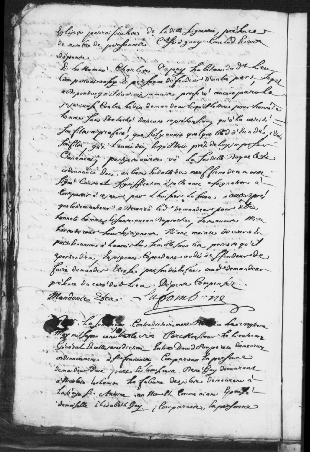 - Le titre complet de la pièce se lit comme suit : Instance entre David Pauperet, demeurant ordinairement à Saint-François, demandeur, à l'encontre de René Gay (Guay), demeurant à Nicolet, et Louis Lefebvre dit Désilets, demeurant à la Baie Saint-Antoine, au nom et comme ayant épousé Élisabeth Gay (Guay), défendeur. Le demandeur, en tant qu'héritier de Marguerite Noblet (Noble), sa mère, réclame la somme de 986 livres auxdits défendeurs en tant qu'héritiers de feu Alexis Gay (Guay) et de la défunte Élisabeth Disy (Dizy), leurs père et mère, à quoi Jean-Baptiste Crevier dit Duverné (Duvernay), pour lors leur tuteur, a été condamné à verser ladite somme à Claude Pauperet, son père, avec les intérêts, par un arrêt du Conseil supérieur de la Nouvelle-France. Les défendeurs répondent que le sieur de Launière, qui a été leur tuteur après la mort du sieur Duverné, a renoncé pour eux à la succession de feu Alexis Gay. Après argumentation, il est [...]