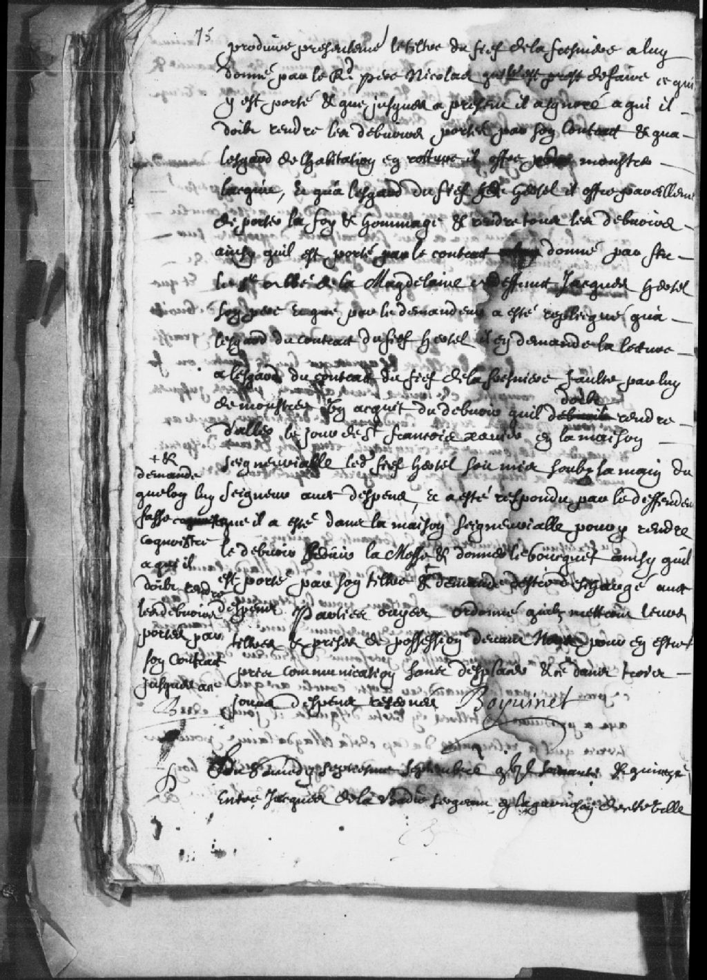 Requête de Jacques de la Badie (Labadie), sergent de la garnison de Trois-Rivières, demandeur, contre Joachim Germaneau, défendeur, demandant la somme de 183 livres et 15 sols de comptes faits à l'audience devant nous; le défendeur reconnaît devoir ladite somme et promet de payer dès qu'il le pourra; ledit défendeur est condamné à payer incessamment ladite somme et les dépens modérés à 40 sols, signé Boyvinet (Boivinet), 7 septembre 1675, Archives nationales à Trois-Rivières, Fonds Juridiction royale des Trois-Rivières, (04T,TL3,S11,P1490).