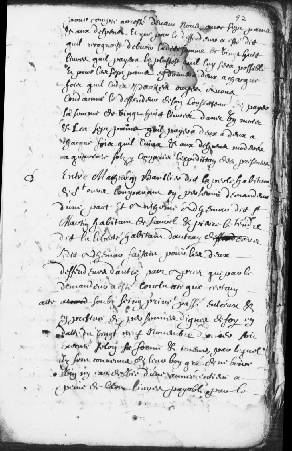 Le titre complet de la pièce se lit comme suit : Requête de Mathurin Banslier (Banlier) dit la Perle (Laperle), habitant de Saint-Ours, demandeur, contre Antoine Adhémar dit Saint-Martin, habitant de Saurel (Sorel) et Pierre le Tendre (Letendre) dit la Liberté (Laliberté), habitant d'Autray, ledit Adhémar faisant pour les 2 défendeurs, demande qu'un certain acte soit exécuté selon lequel ils ne devaient pas boire ni de vin ni d'eau-de-vie pendant une année faute de quoi, le premier contrevenant devra payer la somme de 100 livres, les défendeurs disent avoir demandé la permission de rompre le marché au demandeur avant d'aller boire et demandent d'être déchargés; ladite pièce est déclarée exécutoire, lesdits défendeurs sont condamnés à chacun 100 francs, lesquels seront confisqués au greffe, ou à payer une caution solvable qui sera délivrée au demandeur le 2 novembre prochain, en plus d'être condamnés aux dépens chacun pour leur moitié [...]