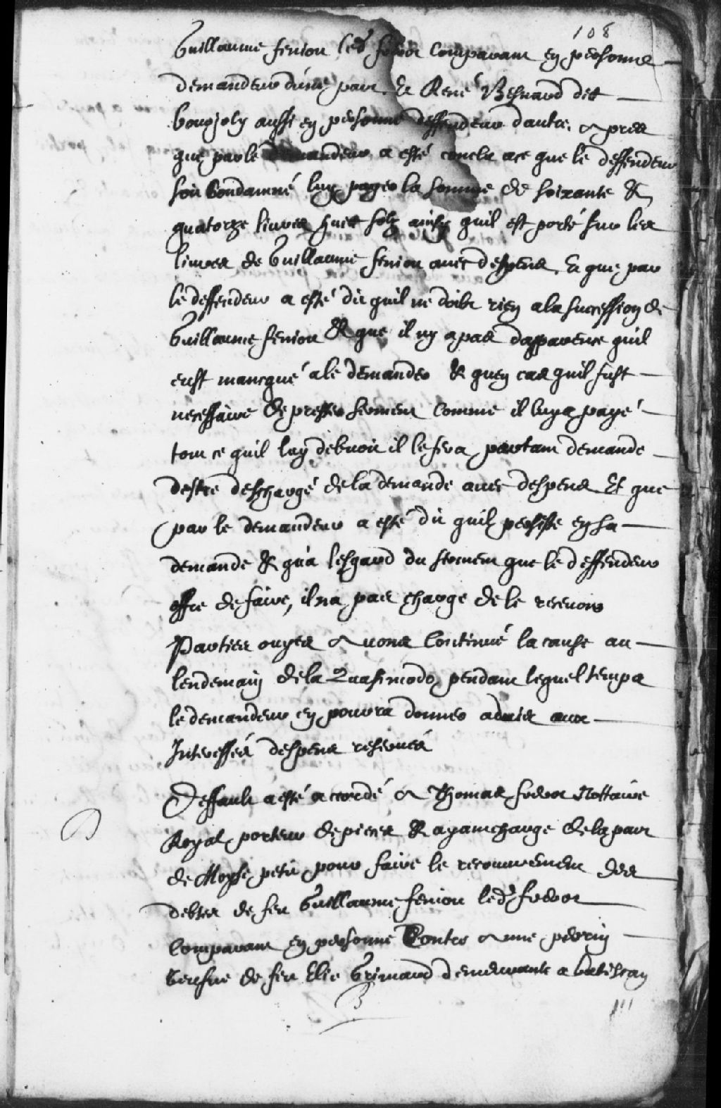 - Le titre complet de la pièce se lit comme suit : Défaut accordé à Thomas Frérot, notaire royal, porteur de pièces et ayant charge, de la part de Moïse Petit, pour faire le recouvrement des dettes de feu Guillaume Feniou, contre Anne Perrin, veuve de feu Élie Grimard, demeurant à Batiscan, suivant l'assignation donnée à ce jour, à défaut de comparaître, ladite défaillante est condamnée à payer la somme de 127 livres et 5 sols portée par une obligation, intérêts, frais et dépens si aucun sont dus et aux dépens des présentes, signé Boyvinet (Boivinet).
