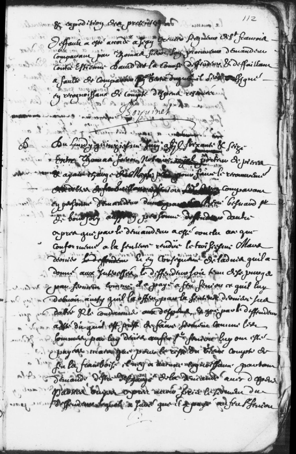 Le titre complet de la pièce se lit comme suit : Requête de Thomas Frérot, notaire royal, porteur de pièces et ayant charge de la part de Moïse Petit, pour faire le recouvrement des dettes de feu Guillaume Feniou, demandeur, contre René Besnard (Bénard), sieur de Bourjoly, défendeur, suivant une sentence du 3 mars dernier et, en vertu d'un avis donné aux intéressés qui demandait au défendeur de se purger par serment qu'il ne doit rien audit Feniou; le défendeur est prêt à faire serment mais, pour le vieux compte de feu Laframboise, il n'en a aucune connaissance; avons donné acte du serment dudit défendeur et condamné ce dernier à payer les 8 sols restants sur lesquels il a déclaré ne pas pouvoir prêter serment alors qu'il fera comparaître sa femme, épouse en premières noces de feu Laframboise, au sujet du vieux compte, dépens réservés en définitive; signé Boyvinet (Boivinet).