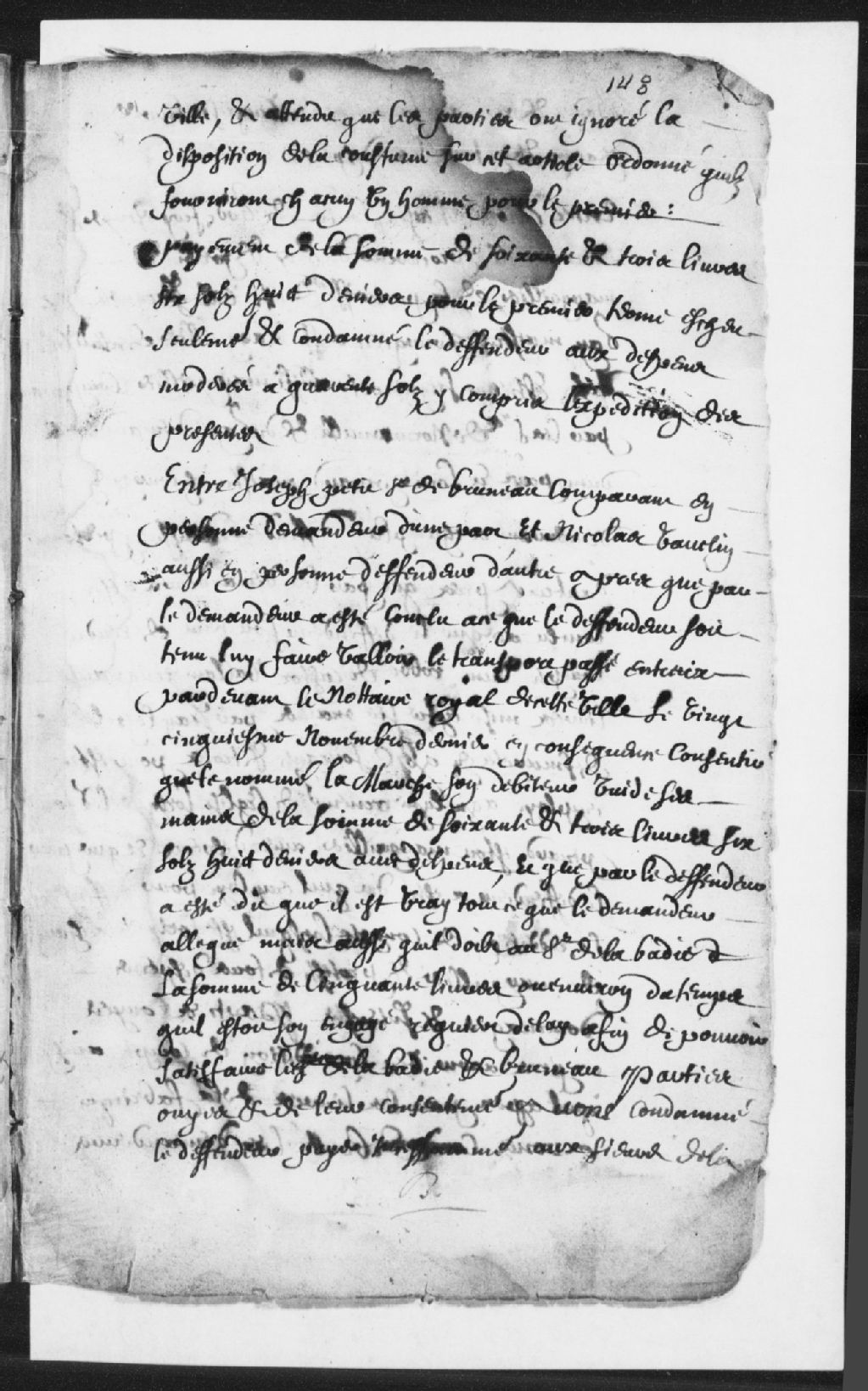 - Le titre complet de la pièce se lit comme suit : Requête de Joseph Petit, sieur de Bruneau, demandeur, contre Nicolas Vauclin, défendeur, demandant de lui faire valoir le transport passé entre eux devant le notaire royal de Trois-Rivières, en conséquence de consentir que ledit la Marche, son débiteur, vide ses mains de la somme de 63 livres, 6 sols et 8 deniers; le défendeur ne nie pas mais dit que le demandeur doit, au sieur de la Badie (Labadie,) la somme de 50 livres du temps qu'il était son engagé et il requiert un délai afin de pouvoir satisfaire lesdits sieurs la Badie et Bruneau; le défendeur est condamné à payer incessamment audits sieurs la somme de 26 livres chacun, avec dépens.