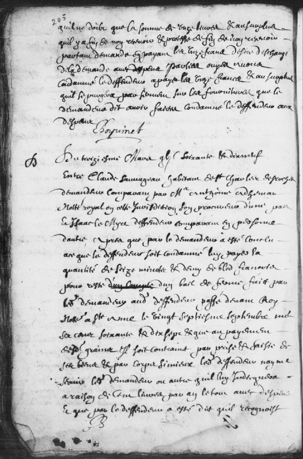 - Le titre complet de la pièce se lit comme suit : Requête de Claude Sauvageau, habitant de Saint-Charles-des-Roches, demandeur, comparant par maître Antoine Adhémar, notaire royal de la Juridiction de Trois-Rivières, son procureur, contre Isaac le Myre (Lemire), défendeur, pour la quantité de 16 minots et demi de blé froment, pour reste de bail à ferme; ledit le Myre reconnaît devoir les 16 minots et demi de blé mais qu'il ne peut que payer 50 livres cette année et 80 livres pour les deux autres années, parce qu'il est en apprentissage chez le sieur Mercelot (Mercereau); ledit défendeur est condamné à payer 16 minots et demi de blé froment, restants du bail à ferme, et ce, dans la fin du mois d'août prochain, sinon il sera contraint à l'emprisonnement, en plus de payer les dépens à 3 livres et 10 sols, nonobstant oppositions et appellations, y compris l'expédition des présentes.