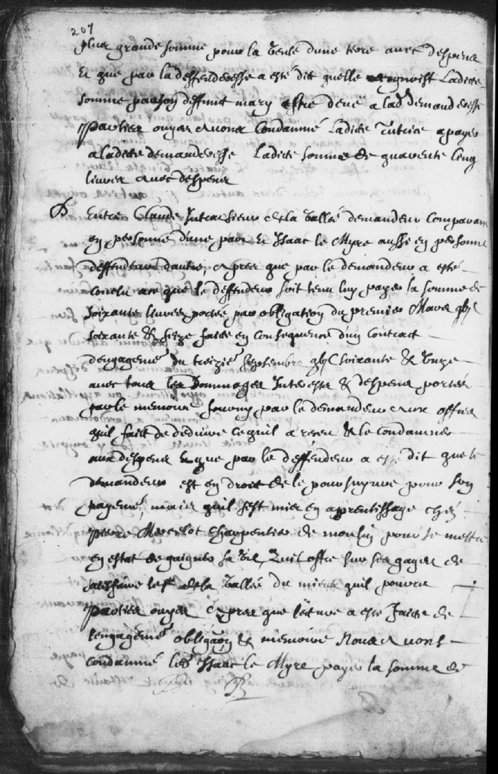 - Le titre complet de la pièce se lit comme suit : Requête de Claude Jutrat (Jutras) sieur de la Vallée (Lavallée), demandeur, contre Isaac le Myre (Lemire), défendeur, pour la somme de 60 livres portée par une obligation du 1er mars 1676 à la suite d'un contrat d'engagement du 13 septembre 1671; le défendeur reconnaît que le demandeur est en droit de le poursuivre mais qu'il est présentement en apprentissage chez Pierre Mercelot (Mercereau) pour gagner sa vie et qu'il offre sur ses gages de satisfaire le sieur de la Vallée du mieux qu'il peut; ledit défendeur est condamné, en vertu du contrat d'engagement, de servir ledit demandeur jusqu'à l'entière satisfaction de ladite somme de 55 livres, à raison de 132 livres par an en plus d'être condamné aux dépens modérés à 75 sols, nonobstant oppositions et appellations, signé Boyvinet (Boivinet).