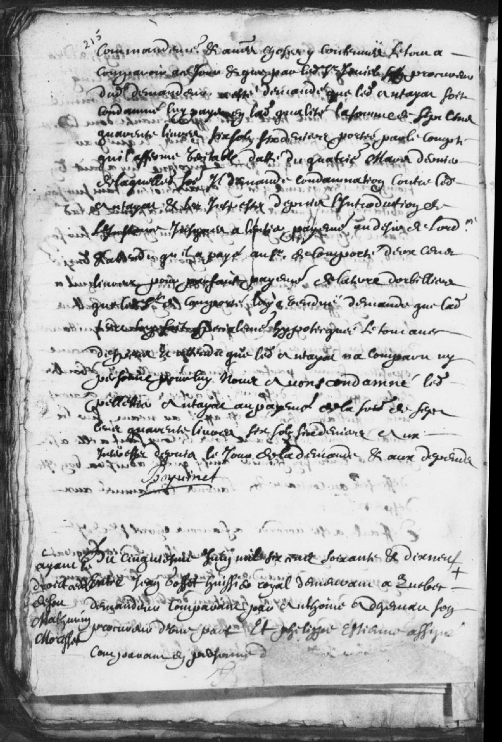 Le titre complet de la pièce se lit comme suit : Requête de Jean Gosset, huissier royal, demeurant à Québec, demandeur, comparant par Antoine Adhémar, son procureur, contre Philippe Estienne (Étienne), pour la somme de 45 livres pour restant d'une vache; ledit Estienne prétend qu'il a payé la somme de 33 livres audit feu Morisset pendant qu'il travaillait au moulin du sieur de la Potterie (Lapoterie), suivant un mémoire et que pour les 12 livres restantes, il va donner ordre à Jean Guyon de les payer pour lui et demande un délai pour se justifier; le défendeur est condamné à payer les 45 livres demandées s'il n'arrive pas à justifier lesdites sommes en son mémoire, et ce, dans la fin du mois d'août prochain en plus d'être condamné aux dépens, signé Boyvinet (Boivinet).