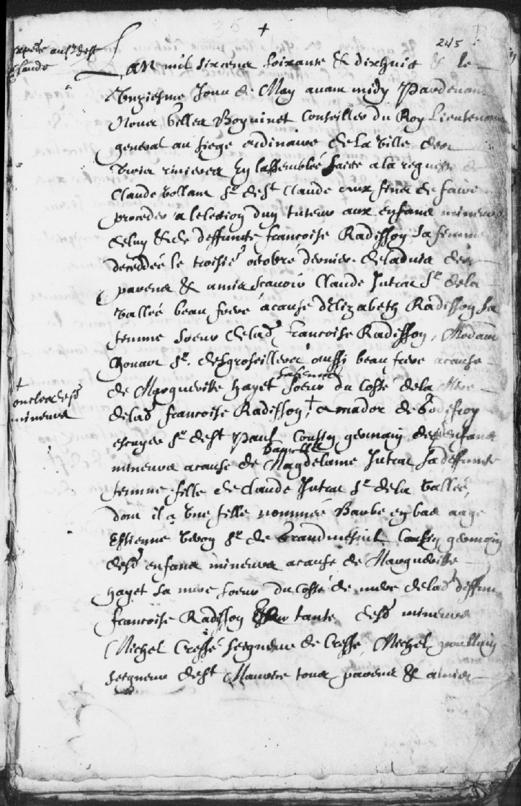 - Le titre complet de la pièce se lit comme suit : Requête de Claude Vollant (Volant), sieur de Saint-Claude, pour l'élection d'un tuteur aux biens et personnes à l'assemblée du 11 mai 1678 par Gilles Boyvinet (Boivinet), conseiller du Roi, intendant général au siège ordinaire de la ville des Trois-Rivières, à la suite du décès de feue Françoise Radisson, sa femme, décédée le 30 octobre dernier; ses enfants sont Pierre et Claude, jumeaux, Étienne, Jean-François, Nicolas, Charles et sa petite-fille Geneviève; ledit demandeur a accepté ladite charge et avons ordonné qu'il soit le tuteur des biens et de ses enfants.Ont été présents: Claude Jutrat (Jutras) sieur de la Vallée (Lavallée), Élisabeth Radisson, sa femme, Médard Chouart sieur des Groseillers (Desgroseillers), Marguerite Hayet (Haiet), sa femme, Étienne Veron sieur de Grandmesnil (Grandménil), Michel Cressé, sieur de Cressé, et Michel Poullain (Poulin), sieur de Saint-Maurice; en [...]