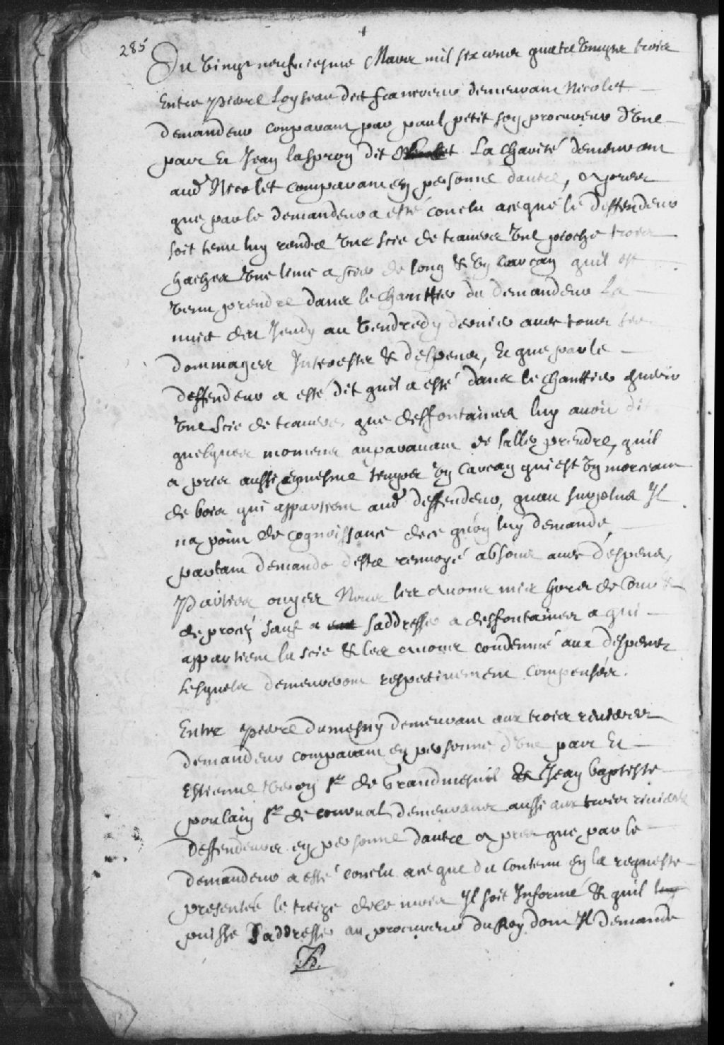 Le titre complet de la pièce se lit comme suit : Requête de Pierre Dumesny (Mesny), demeurant aux Trois-Rivières, demandeur, contre Étienne Veron, sieur de Grandmesnil (Grandménil) et Jean-Baptiste Poulain (Poulin), sieur de Courval, demeurant aussi aux Trois-Rivières, défendeurs; demandant d'être informé du contenu de la requête présentée le 13 de ce mois et qu'il puisse s'adresser au procureur du Roi dont il demande la sanction; il est ordonné qu'ils ne pourront s'éloigner de la ville, en cas d'assignations prochaines; dépens réservés, signé Boyvinet (Boivinet).