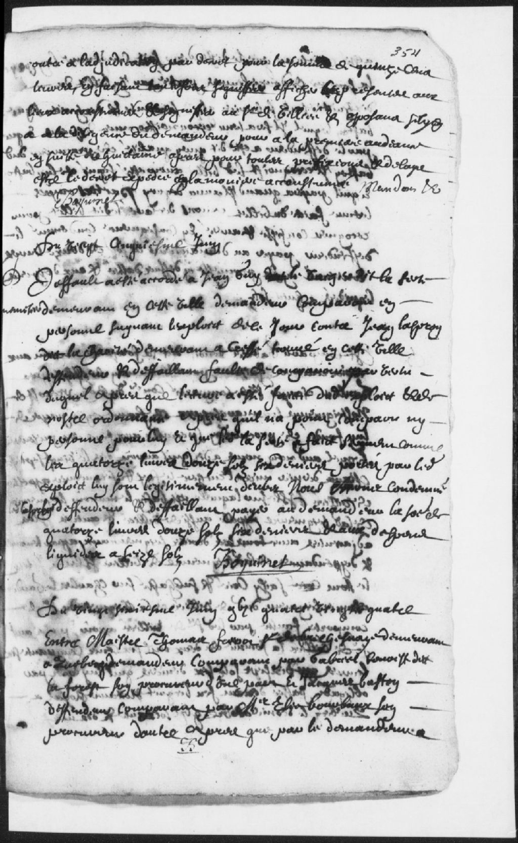 - Requête de maître Thomas Frérot, sieur de la Chesnaye (Lachesnaye), demandeur, comparant par Gabriel Benoist (Benoît) dit la Forest (Laforest), son procureur, contre Jacques Baston, défendeur, comparant par Élie Bourbaux (Bourbeau), son procureur...