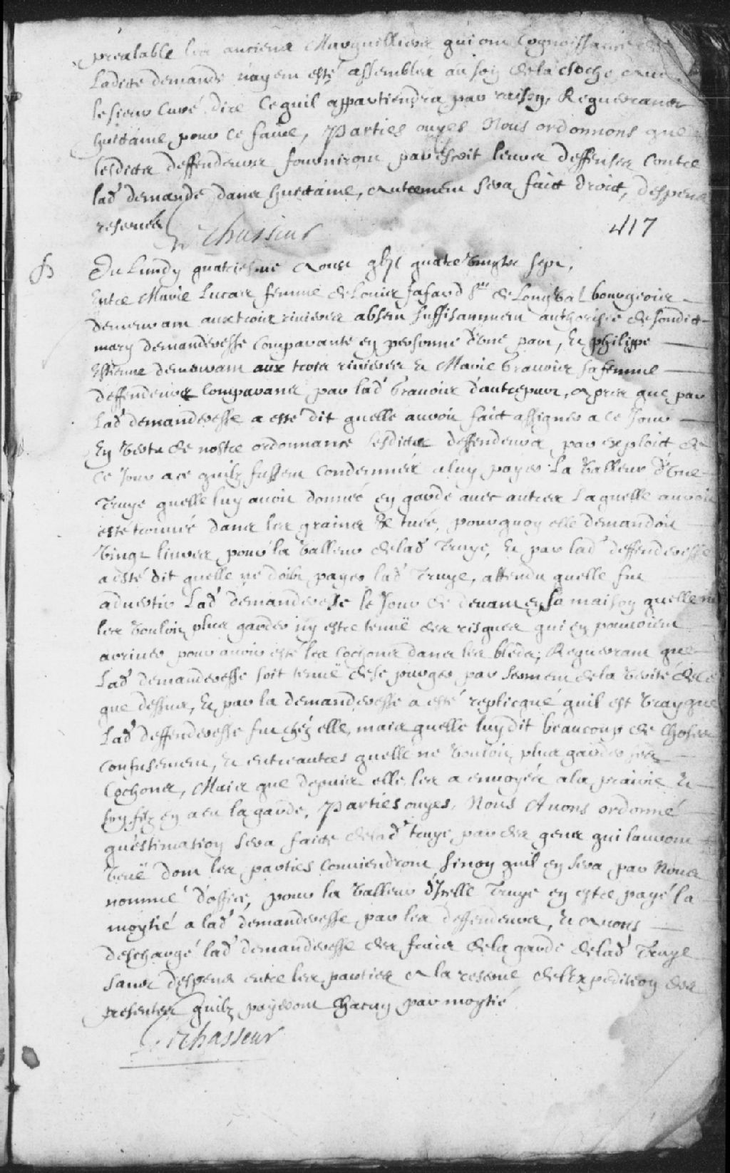 Le titre complet de la pièce se lit comme suit : Requête de Marie Lucas, femme de Louis Fafard, sieur de Long Val (Longval), bourgeois, demeurant aux Trois-Rivières, demanderesse, contre Philippe Estienne (Étienne) et sa femme Marie Gravois, défendeurs, aussi des Trois-Rivières, pour la somme de 20 livres pour la valeur de sa truie qu'elle aurait donnée en garde aux défendeurs et qu'elle aurait retrouvée morte dans les grains; ladite Gravois dit qu'elle aurait averti, la veille, qu'elle ne voulait plus la garde et qu'elle ne serait plus responsable des risques concernant ladite truie; il eset ordonné que la truie soit estimée et que les défendeurs seront tenus de payer la moitié de sa valeur alors que les parties sont chacun condamnés à la moitié des dépens, signé le Chasseur (Lechasseur).