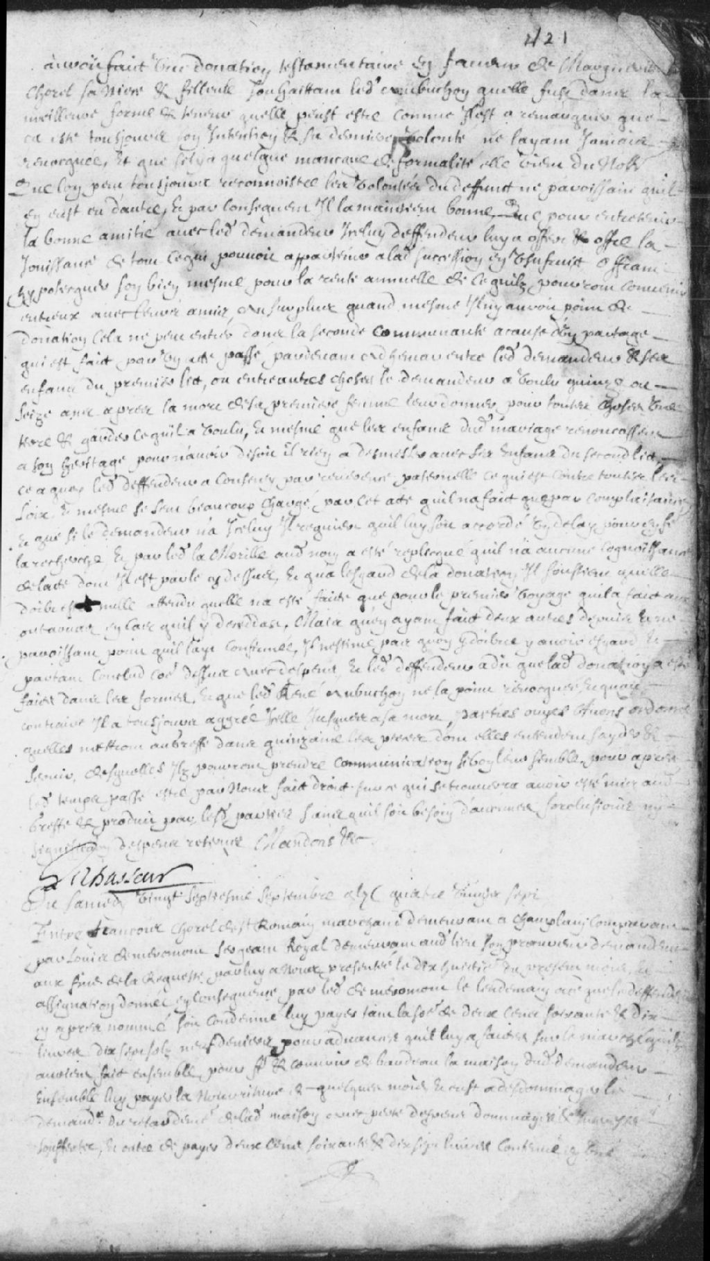 - Le titre complet de la pièce se lit comme suit : Requête de François Chorel, sieur de Saint-Romain, demeurant à Champlain, comparant par Louis de Meromont (Merommont), sergent royal, son procureur, demandeur, contre Louis Gilleber (Gilbert) et Marie-Thérèse Galien, veuve de Laurent Gouin, que ledit défendeur a depuis épousée, pour la somme de 270 livres, 17 sols et 9 deniers, suivant l'avance faite par un marché fait entre eux pour couvrir de bardeaux la maison dudit demandeur; le défendeur est condamné à finir la couverture de ladite maison et interdiction de travailler ailleurs et, au demandeur, avons donné la permission de faire faire ladite couverture et de faire payer les frais par le défendeur si le travail n'est pas accompli; ledit défendeur est condamné aux dépens modérés à 55 sols, non compris l'expédition des présentes, signé le Chasseur (Lechasseur).Il est aussi question de monseigneur de Varenne (Varennes).