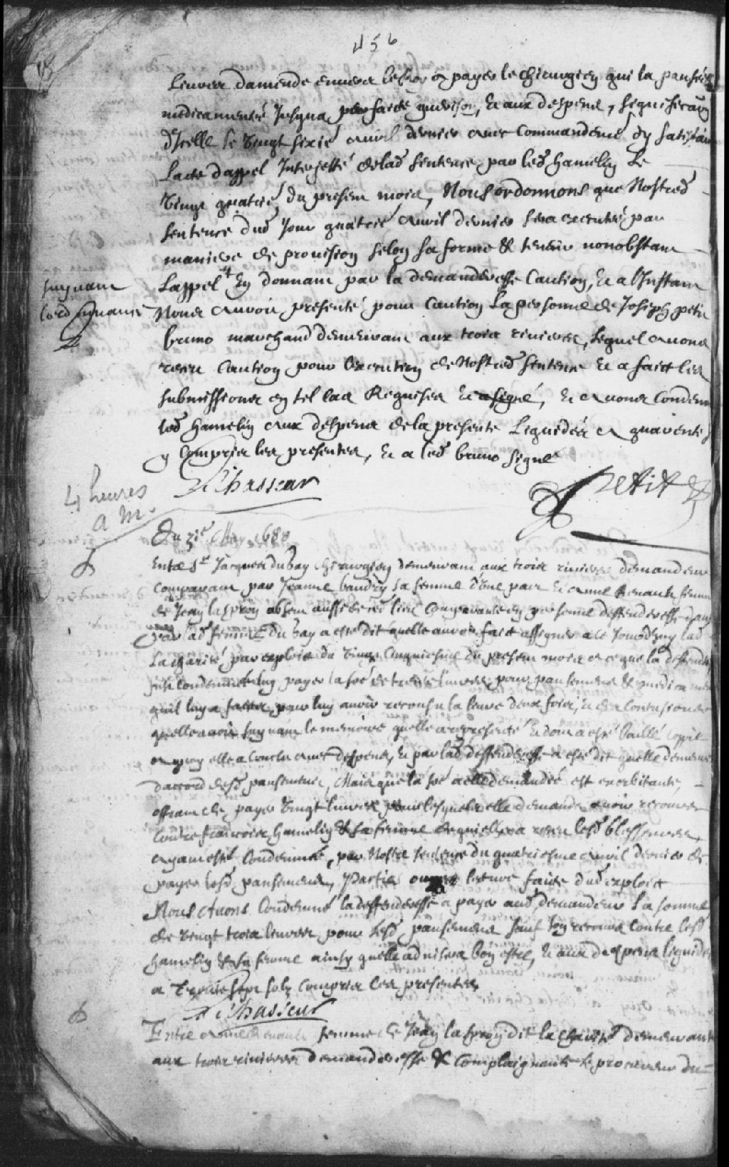 - Le titre complet de la pièce se lit comme suit : Requête d'Anne Renault (Renaud), femme de Jean Laspron (Lampron) dit la Charité (Lacharité), demanderesse et complaignante, contre François Hamelin et Marie-Madeleine Aubert, sa femme, aussi des Trois-Rivières, défendeurs, pour lui rembourser la somme de 30 livres pour laquelle elle a été condamnée lors de la sentence précédente, au profit du sieur du Gay (Duguay), chirurgien, pour des pansements et médicaments; les défendeurs sont condamnés à payer la somme de 23 livres, somme qui avait été réduite lors de la condamnation et 37 sols pour les dépens qu'elle a dû payer et aussi condamnés aux dépens liquidés à 37 sols, y compris les présentes, signé le Chasseur (Lechasseur).