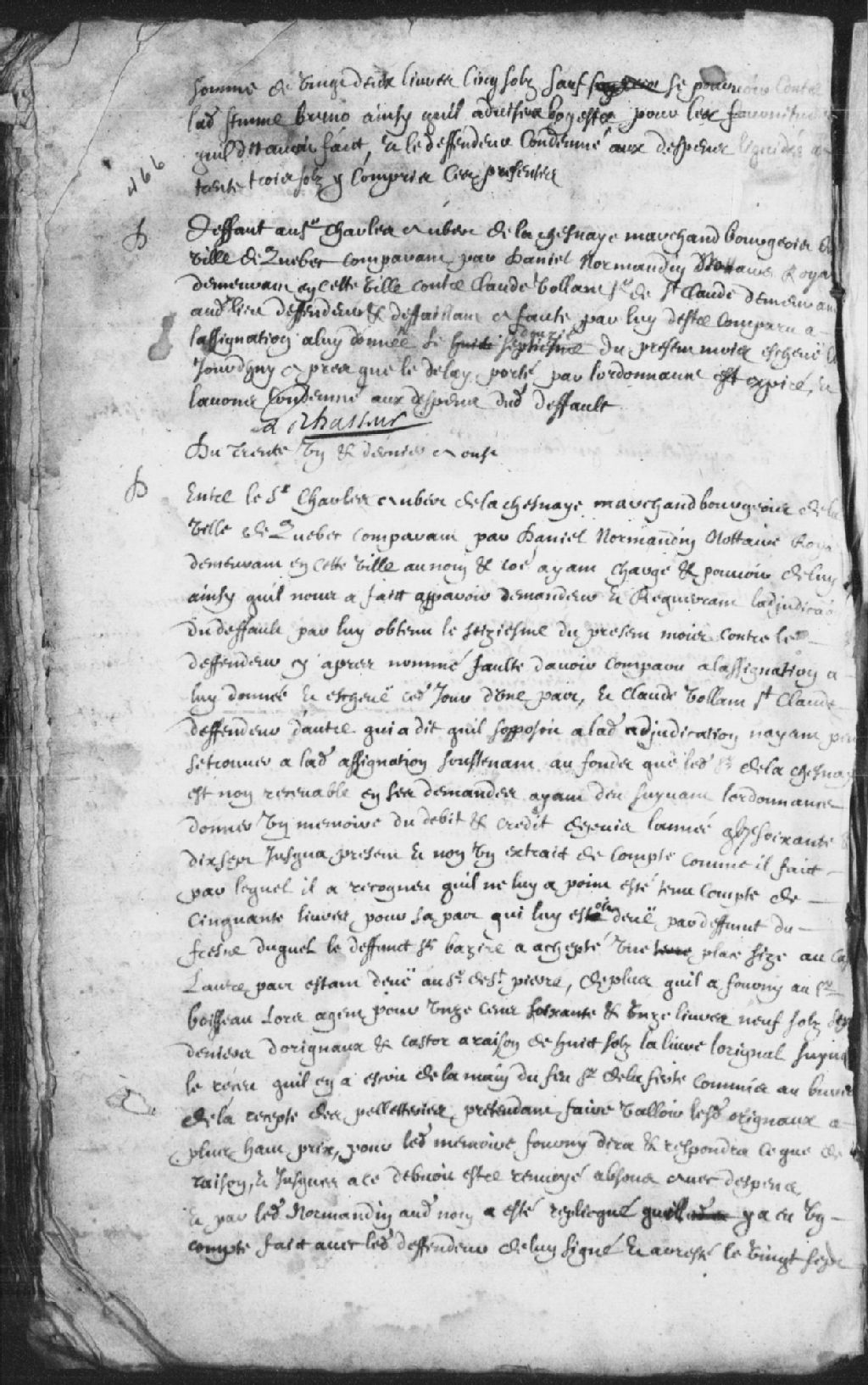 Défaut accordé au sieur Charles Aubert de la Chenaye (Lachesnaye), marchand, bourgeois de Québec, comparant par Daniel Normandin, notaire royal demeurant à Trois-Rivières, contre Claude Vollant (Volant), sieur de Saint-Claude, défendeur et défaillant, faute de comparaître à l'assignation portée le 12 août dernier, ledit défaillant est condamné aux dépens, signé le Chasseur (Lechasseur), 6 août 1688, Archives nationales à Trois-Rivières, Fonds Juridiction royale des Trois-Rivières, (04T,TL3,S11,P1859).