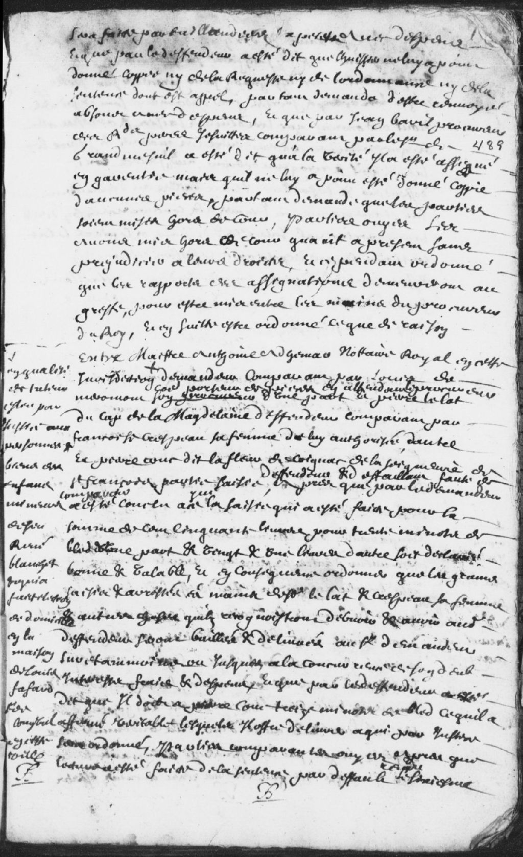 Le titre complet de la pièce se lit comme suit : Appel de sentence de maître Antoine Adhémar, notaire royal de la Juridiction de Trois-Rivières, en qualité de tuteur élu par justice à la personne et biens de feu René Blanchet (Blanchette) et qui a fait élection de domicile en la maison de Louis Fafard, sieur de Long Val (Longval), demandeur, comparant par Louis de Meromont (Merommont), comme porteur de pièces, contre Pierre le Lat (Lelat), du Cap-de-la-Madeleine, défendeur, comparant par Françoise Crespeau (Crépeau), sa femme, et Pierre Couc dit la Fleur (Lafleur) de Coignac (Cognac), de la seigneurie de Saint-François, partie saisie, défendeurs et défaillants, pour que la sentence soit déclarée bonne et valable; il est ordonné que la saisie soit baillée au demandeur jusqu'à la concurrence de son dû et à Pierre le Lat d'être déchargé comme dépositaire alors que Pierre Couc est condamné aux dépens liquidés à 9 livres et 16 sols, signé [...]