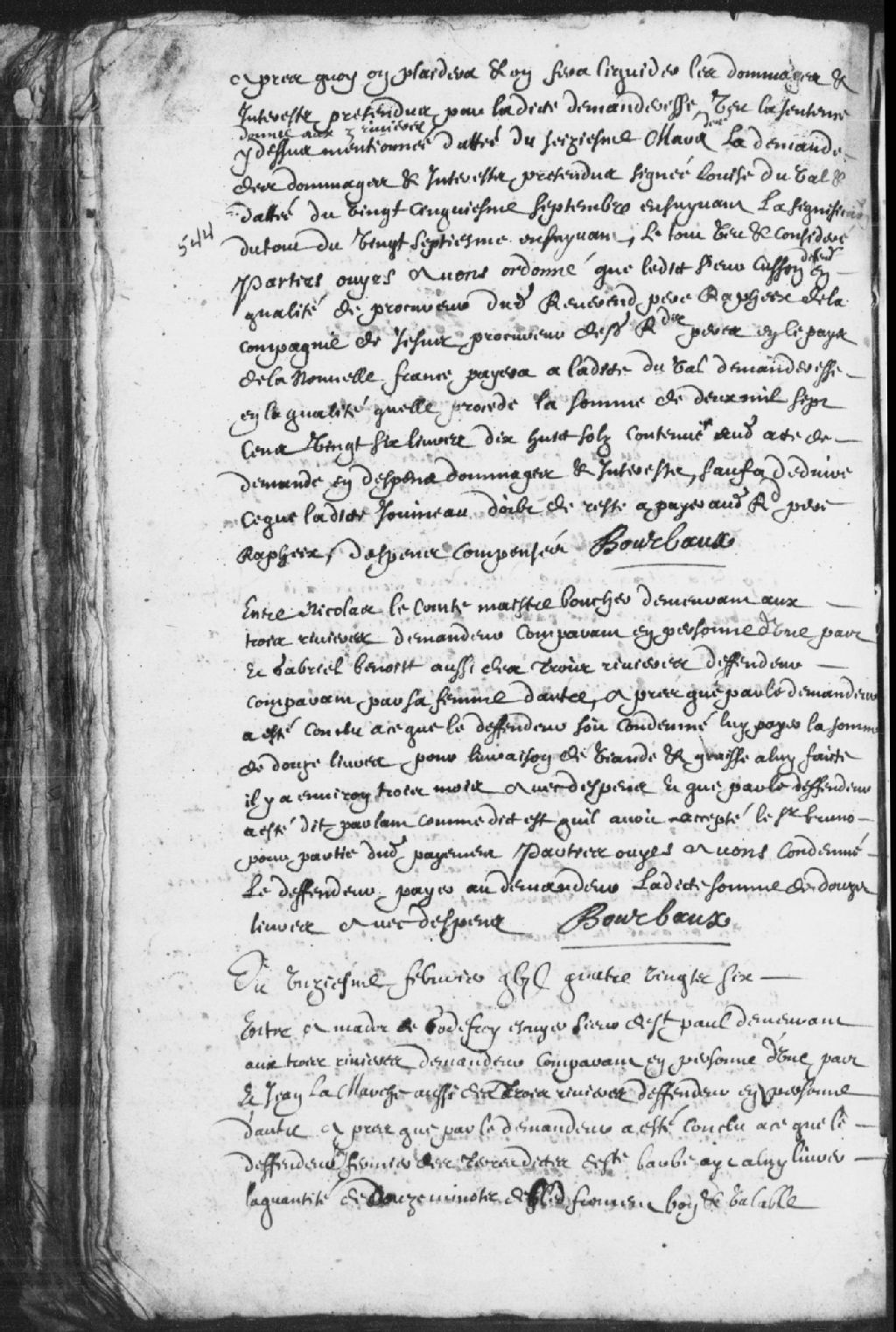 - Le titre complet de la pièce se lit comme suit : Requête d'Amador de Godefroy, écuyer, sieur de Saint-Paul, demeurant aux Trois-Rivières, demandeur, contre Jean la Marche (Lamarche), aussi des Trois-Rivières, défendeur et fermier des terres de Sainte-Barbe, pour une quantité de 12 minots de blé froment, bon et valable qu'il doit pour 2 années; avons annulé le bail mais le défendeur pourra demeurer dans la maison jusqu'au 15 mai prochain, sans préjudice, et il devra livrer les 12 minots de blé dans 3 semaines, dépens compensés, signé Bourbaux (Bourbeau).