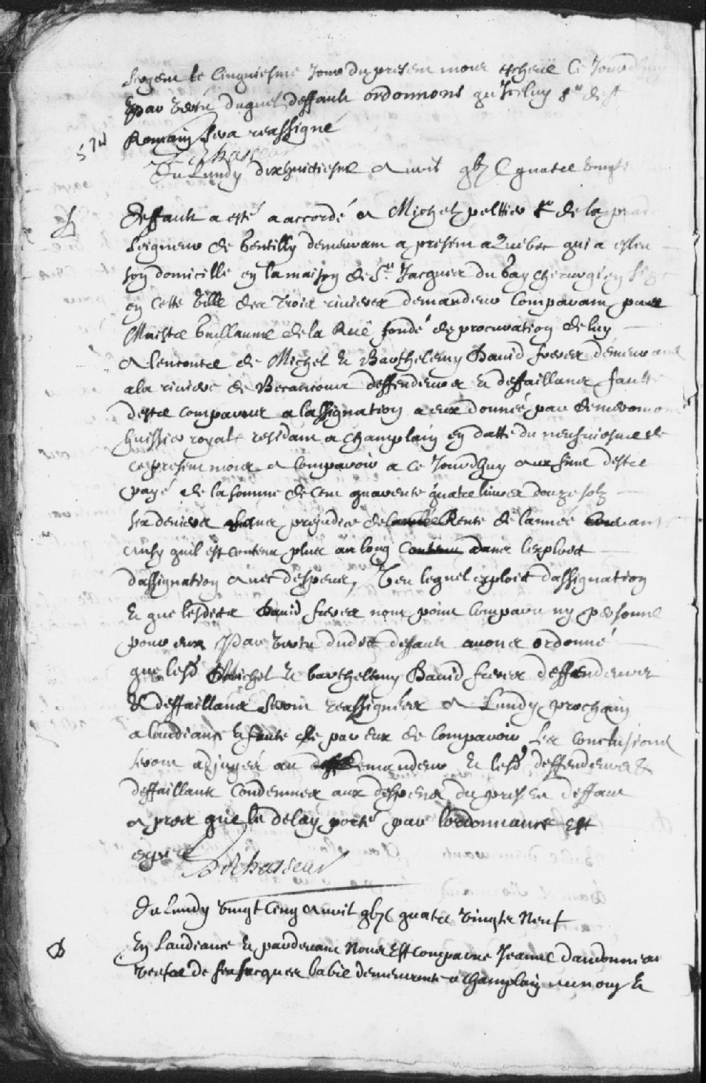 Le titre complet de la pièce se lit comme suit : Défaut accordé à Michel Pelletier, sieur de la Prade (Laprade), seigneur de Gentilly, demeurant à Québec, qui a élu domicile en la maison de Jacques du Gay (Duguay), chirurgien des Trois-Rivières, demandeur, contre Michel et Barthélemy David, frères de la rivière Bécancour, défendeurs et défaillants, faute de comparaître à l'assignation qui leur a été donnée le 9 avril dernier; il est ordonné que les défendeurs soient réassignés à lundi prochain et condamnés aux dépens du présent défaut, signé le Chasseur (Lechasseur).