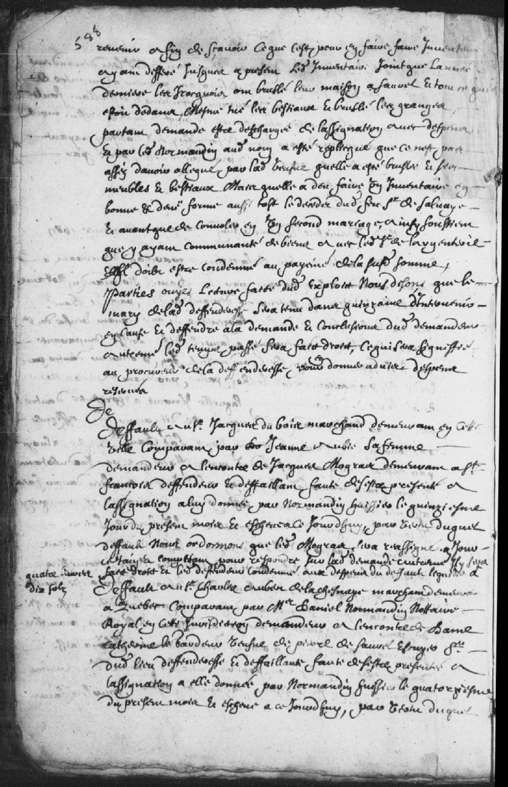 - Le titre complet de la pièce se lit comme suit : Défaut accordé au sieur Charles Aubert de la Chesnaye (Lachesnaye), marchand, demeurant à Québec, comparant par Daniel Normandin, notaire royal de la Juridiction de Trois-Rivières, demandeur, contre Catherine le Gardeur (Legardeur), veuve de Pierre de Saurel (Sorel), écuyer et sieur dudit lieu, défenderesse et défaillante, faute de comparaître à l'assignation qui lui a été donnée le 14 juin dernier; il est ordonné que la défenderesse soit réassignée et condamnée aux dépens du présent défaut, liquidés à 8 livres et 10 sols.