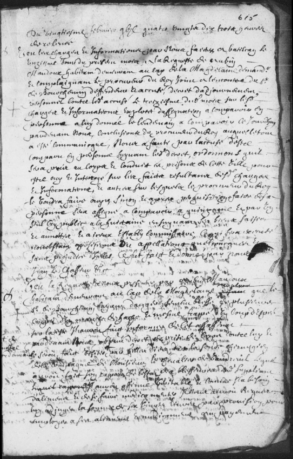 Requête d'Aubin Maudoux (Maudou), habitant demeurant au Cap-de-la-Madeleine, demandeur et complaignant, contre le sieur de Bourchemin (Dubourchemin), défendeur et accusé par décret d'ajournement personnel; faute d'avoir comparu en personne, il est ordonné que l'accusé sera pris au corps et conduit à la prison de Trois-Rivières pour y être entendu et interrogé et il sera assigné à comparaître dans 15 jours, fait et donné par Jean le Chasseur (Lechasseur), 20 février 1690, Archives nationales à Trois-Rivières, Fonds Juridiction royale des Trois-Rivières, (04T,TL3,S11,P2001).
