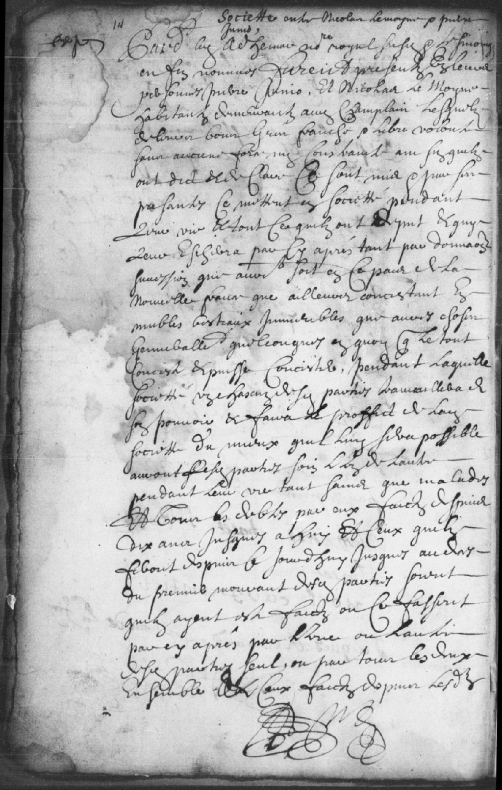 - Société entre Nicolas le Moyne (Lemoine, Lemoyne) et Pierre Junio (Juneau), veuf d'Anne Rousseau, habitants de Champlain, partageant l'ensemble de leurs possessions, profits et dettes contractées depuis 10 ans et dettes à venir...