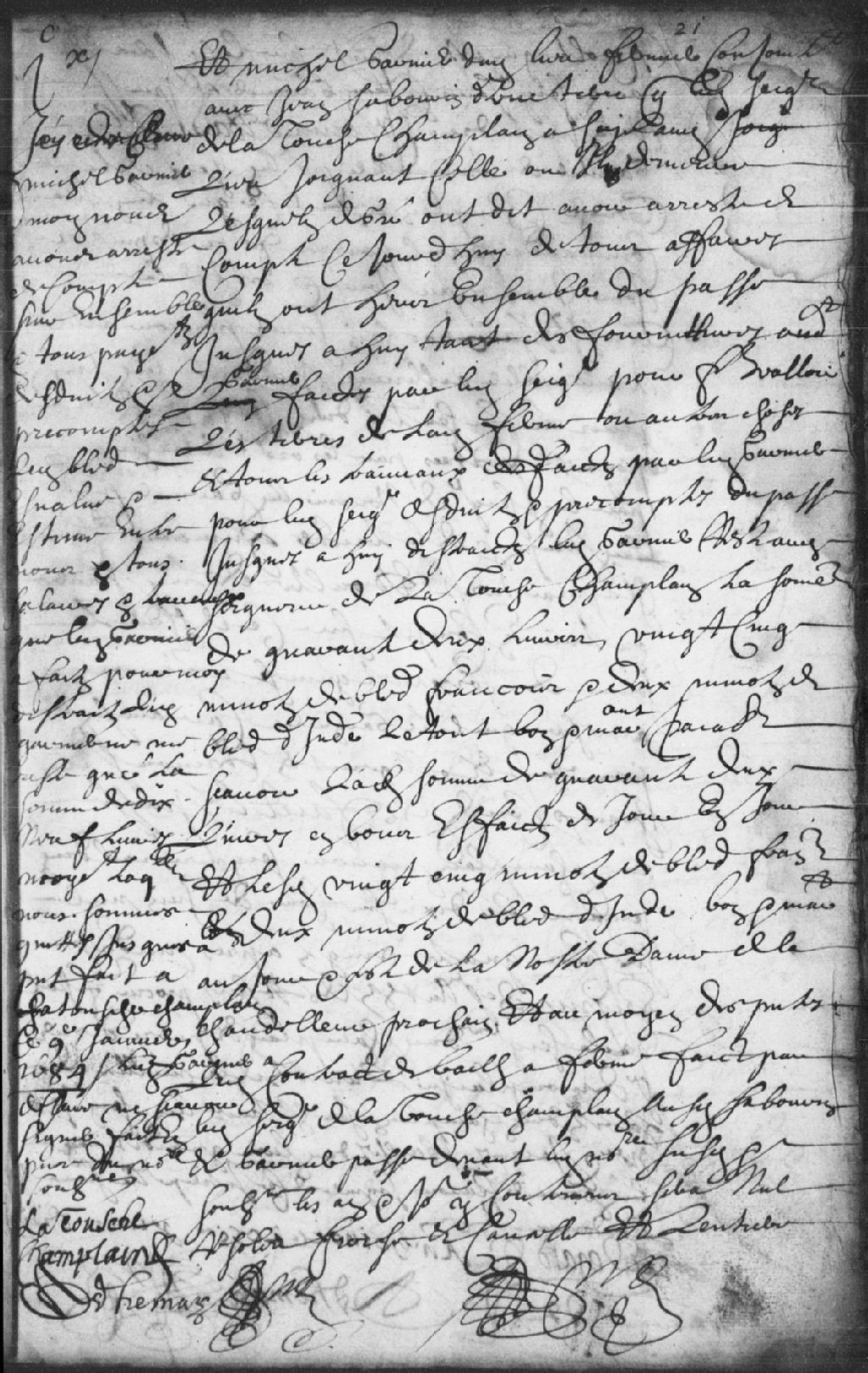 Déclaration d'Étienne Pézard (Pesard) de la Tousche (Latouche) Champlain affirmant que Michel Garnier ne lui doit plus que 19 livres pour être vidé de compte, 9 janvier 1684, Archives nationales à Trois-Rivières, Fonds Juridiction royale des Trois-Rivières, (04T,TL3,S11,P2046).