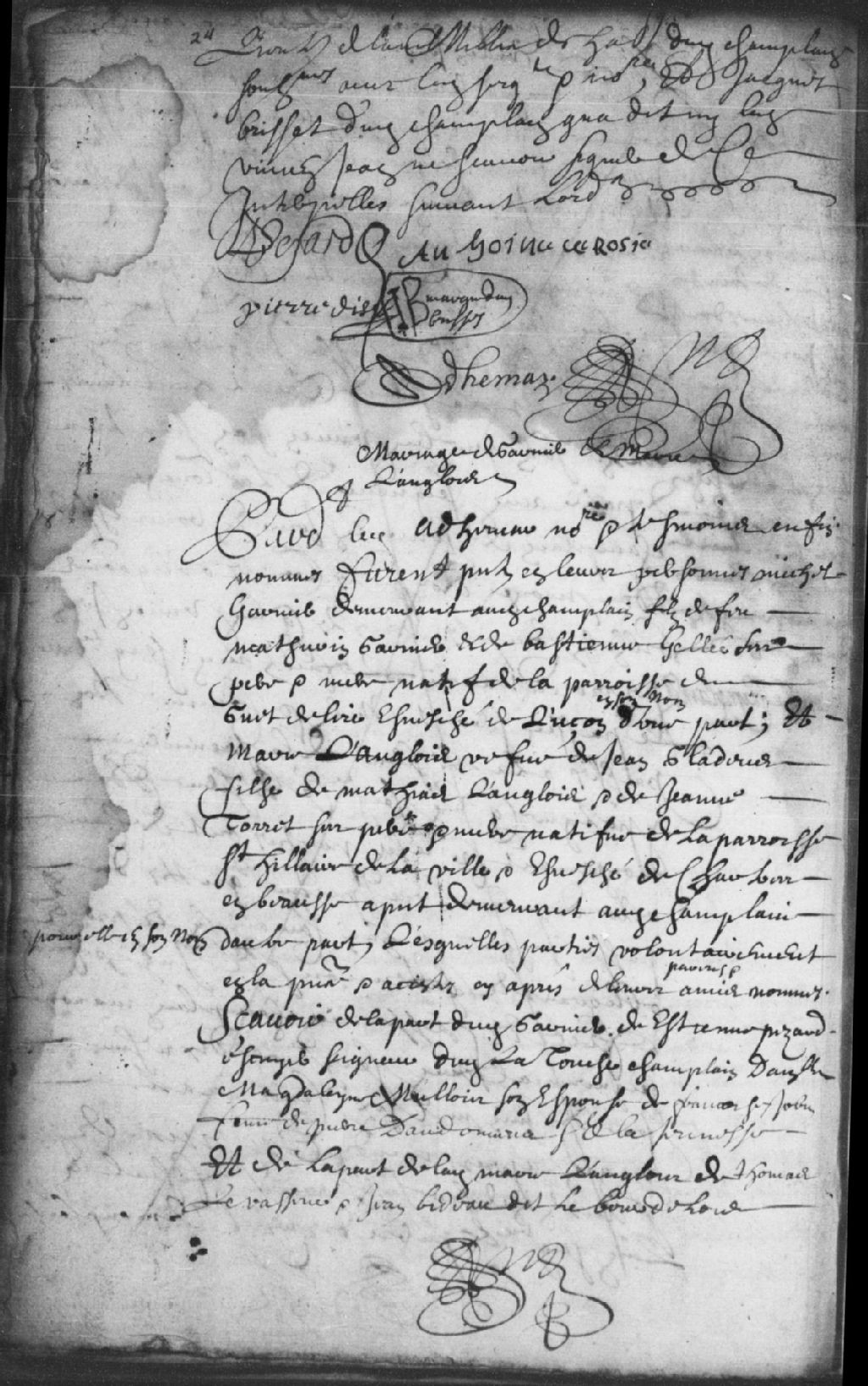 - Le titre complet de la pièce se lit comme suit : Contrat de mariage entre Michel Garnier (Grenier) et Marie Langlois de Champlain lesquels font communauté de leurs biens, meubles et immeubles respectifs, mais ne sont tenus des dettes et hypothèques de l'un et de l'autre contractées avant leur mariage, advenant que le futur époux décède avant ladite future épouse, ce dernier lui fait donation entre vifs de tout ce qu'il aura accumulé jusque là, sans exception, à moins qu'ils aient eu un enfant du fruit de leur mariage, ce que ladite épouse s'engage à faire de même, à moins qu'ils aient eu un enfant de leur futur mariage ou qu'aucun des enfants de ladite épouse et de Jean Gladeus (Gladu), son premier mari, ne vinssent à décéder avant d'avoir atteint l'âge de 25 ans ou s'être marié.