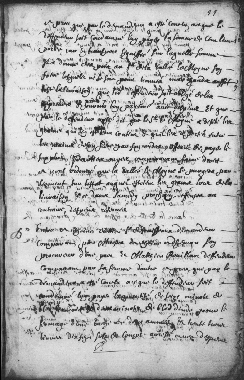 - Le titre complet de la pièce se lit comme suit : Requête d'Antoine Trottier sieur DesRuisseaux, demandeur comparant par maître Antoine Adhémar, son procureur, contre Mathieu Rouillar (Rouillard), défendeur, comparant par sa femme, pour qu'il lui paye la quantité de 16 minots de blé français et deux minots de blé d'Inde pour le fermage d'une vache de 2 années, et 33 livres et 17 sols de compte arrêté avec dépens, lequel défendeur dit qu'on ne peut le justifier de bail à ferme et offre de payer à raison de 20 francs par an pour le terme des 33 livres et 17 sols, ordonné audit défendeur de payer les 2 années de ferme de la vache à raison de 8 minots de blé français loyal et marchand et 1 minot de blé d'Inde (maïs) pour chaque année, ainsi que la somme de 33 livres et 10 sols de compte arrêté, plus les dépens modérés à 41 sols, et ce dans la veille des fêtes de Noël 1679.