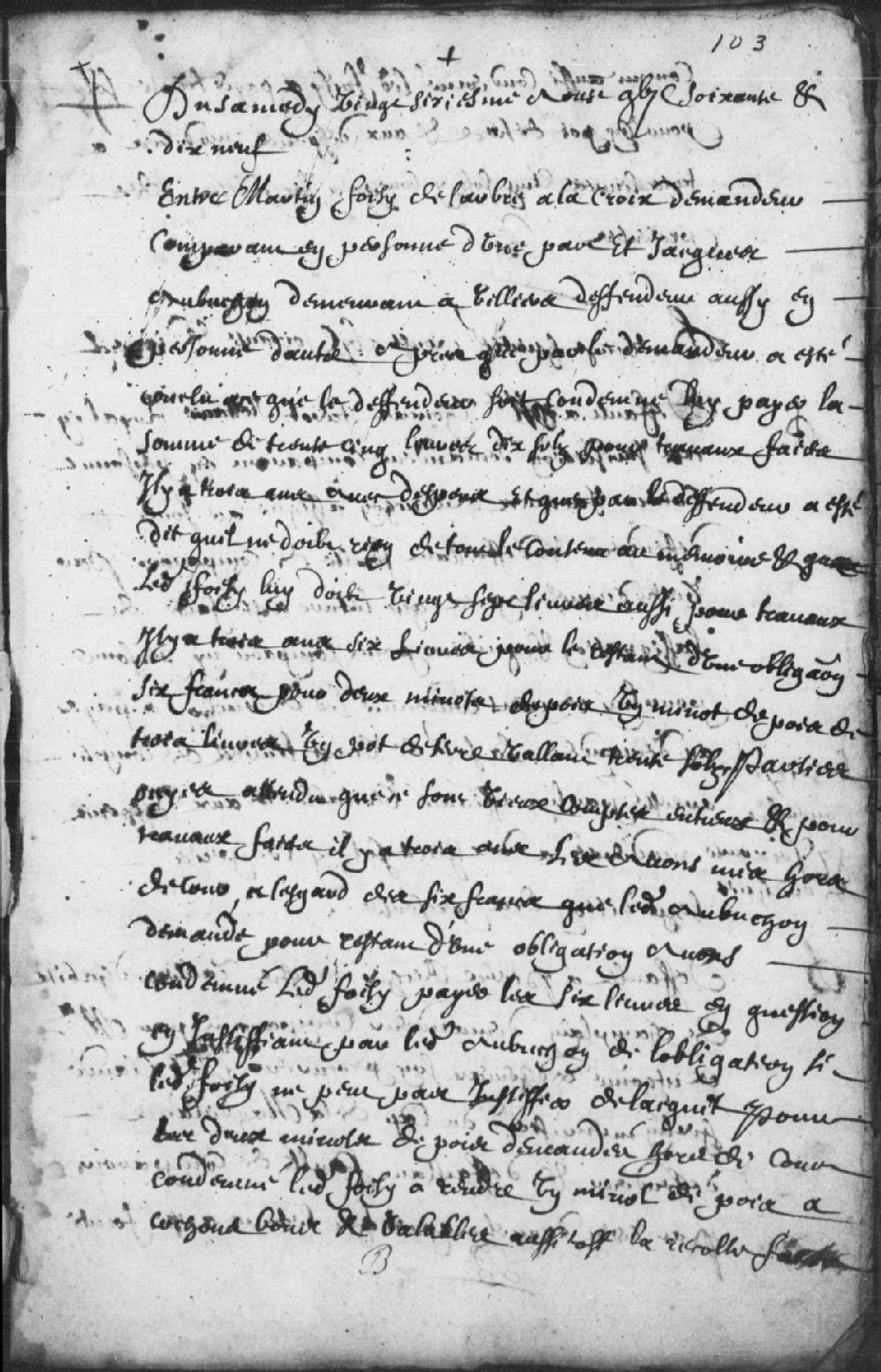 - Le titre complet de la pièce se lit comme suit : Requête de Martin Foisy, de l'Arbre-à-la-Croix, demandeur, contre Jacques Aubuchon, demeurant à Villiers, défendeur, pour qu'il lui paye 35 livres et 10 sols pour des travaux faits il y a 3 ans, lequel défendeur a affirmé ne rien devoir de tout le contenu du mémoire et que ledit demandeur lui doit 26 livres pour des travaux d'il y a 3 ans, 6 livres pour le restant d'une obligation, 6 francs pour 2 minots de pois, un minot de pois de 3 livres et un pot de terre valant 30 sols, ordonné que pour les vieux comptes et les travaux d'il y a trois ans les parties soient mises hors de cours, que ledit Foisy paye lesdits 6 francs de ladite obligation, en autant que ledit Aubuchon la justifie, que si ledit Foisy ne peut pas se justifier des 2 minots de pois demandés hors cour il est condamné à donner audit Aubuchon 1 minot de pois à cochon aussitôt la récolte faite, et que ledit Foisy paye audit [...]