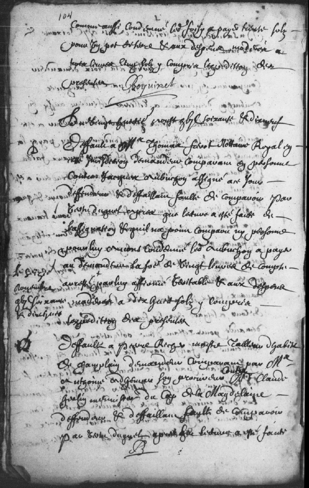 Défaut accordé à Pierre Richer, maître tailleur, demeurant à Champlain, comparant par maître Antoine Adhémar, son procureur, contre maître Claude Herlin, menuisier du Cap-de-la-Madeleine, défendeur, lequel a fait défaut, ordonné que, de par son défaut, le défendeur soit tenu de payer audit Richer la somme de 6 livres, tel que contenu dans son mémoire du 15 de ce présent mois et signé par lui, plus les dépens modérés à 34 sols, 28 août 1679, Archives nationales à Trois-Rivières, Fonds Juridiction royale des Trois-Rivières, (04T,TL3,S11,P2082).