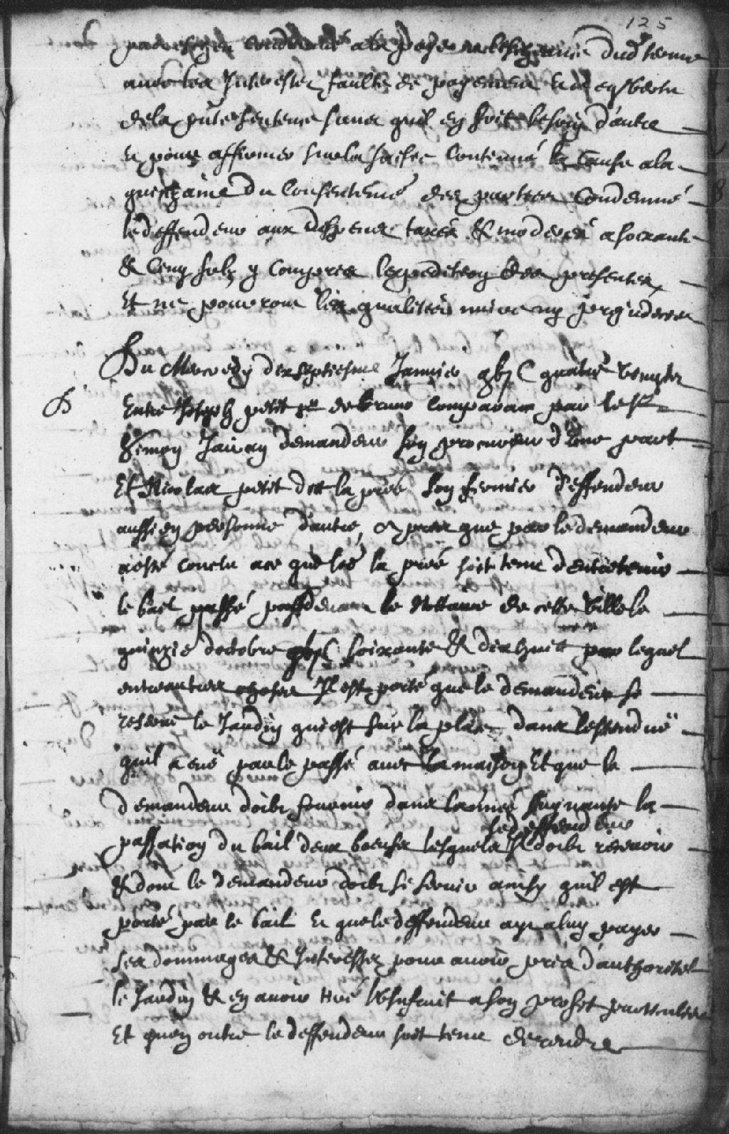 - Le titre complet de la pièce se lit comme suit : Requête de Joseph Petit sieur de Bruno (Bruneau), comparant par le sieur Simon Jaran (Jarent), son procureur, demandeur, contre Nicolas Petit dit la Pré (Lapré - Laprée), son fermier, défendeur, pour que ledit la Pré soit tenu d'entretenir le bail, passé devant le notaire de Trois-Rivières le 15 octobre 1678, par lequel il est porté que ledit demandeur se réserve le jardin qui est sur la place qu'il y eut par le passé avec la maison et que ledit demandeur doit fournir audit défendeur 2 boeufs, ledit Bruno demande aussi que ledit défendeur lui paye les dommages et intérêts pour avoir pris l'autorité dudit jardin, et en avoir tiré l'usufruit à son profit, et qu'il soit obligé de rendre à la dame Seigneuret 2 pièces de bois, lequel a demandé que lui soient rendus 200 pieux, que ledit demandeur lui a pris, ce dernier a de plus affirmé que ledit demandeur lui a enlevé, avant la passation du [...]