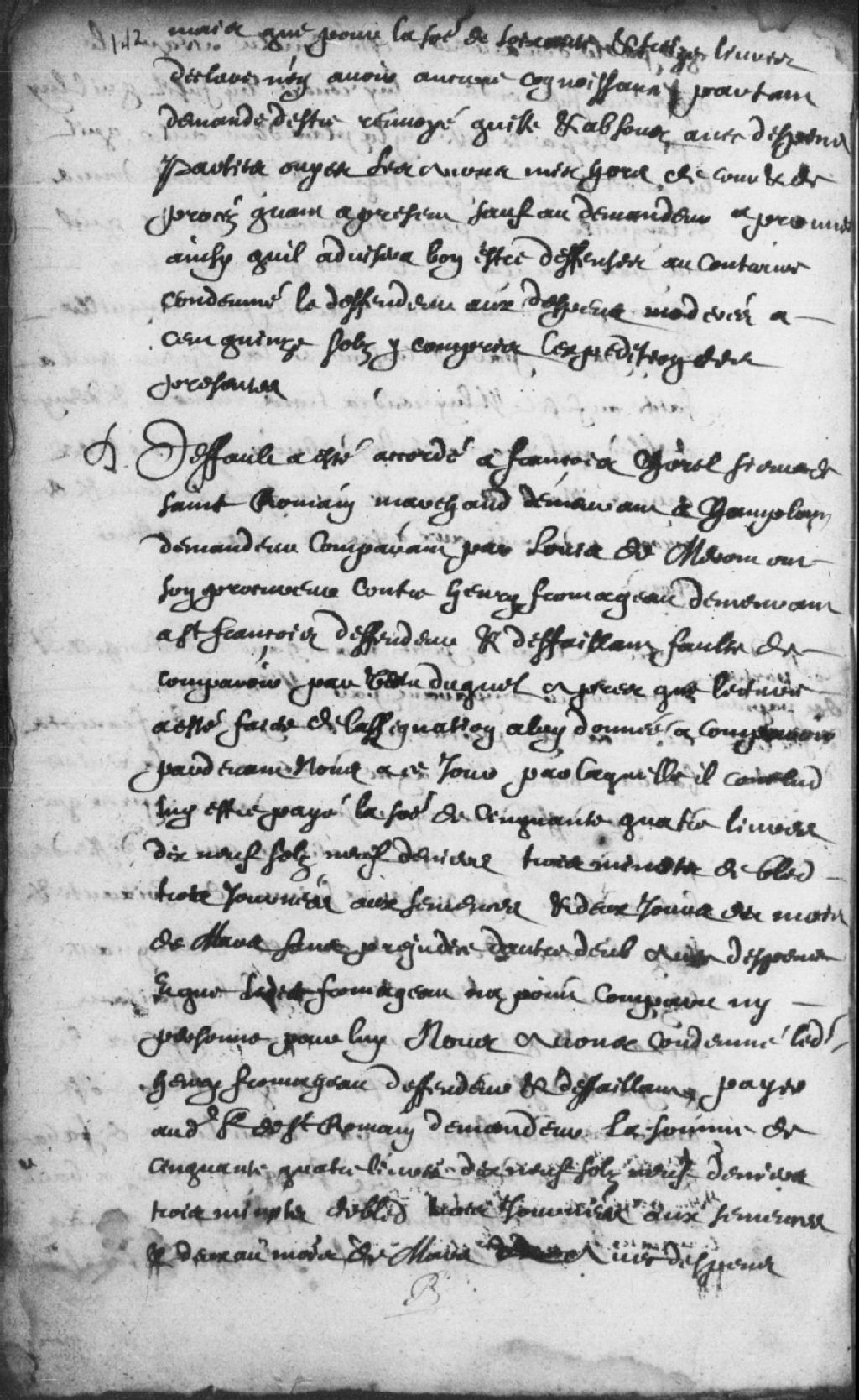 - Le titre complet de la pièce se lit comme suit : Défaut accordé à François Chorel sieur de Saint-Romain, marchand demeurant à Champlain, demandeur, comparant par Louis DeMeromont, son procureur, contre Henri Fromageau, demeurant à Saint-François, défendeur, pour qu'il lui paye 54 livres, 19 sols, 9 deniers, 3 minots de blé, 3 journées aux semences et 2 jours au mois de mars, lequel a fait défaut, ordonné que, de par son défaut, ledit défendeur paye audit demandeur 54 livres, 19 sols, 9 deniers, 3 minots de blé, 3 journées aux semences et 2 jours au mois de mars, plus les dépens modérés à 100 sols.