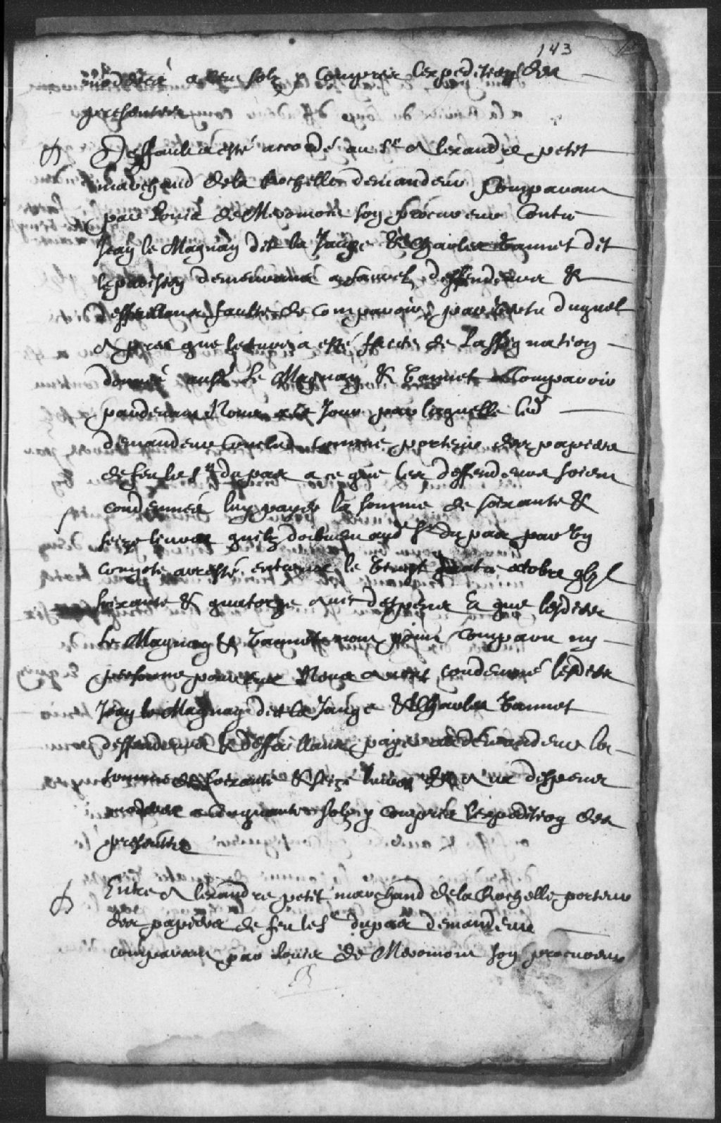 Le titre complet de la pièce se lit comme suit : Défaut accordé à sieur Alexandre Petit, marchand de LaRochelle, porteur des papiers du défunt sieur Dupas, demandeur, comparant par Louis Demeromont, son procureur, contre Jean le Magnan (Lemagnan) dit la Jauge (LaGeauge) et Charles Vannet (Vanet) dit le Parisien (LeParisien), demeurant à Sorel, pour la somme de 76 livres qu'ils doivent audit sieur Dupas par un compte arrêté entre eux le 24 octobre 1674, lesquels ont fait défaut, ordonné que, de par leur défaut, lesdits défendeurs payent audit demandeur la somme de 76 livres, plus les dépens modérés à 50 sols.