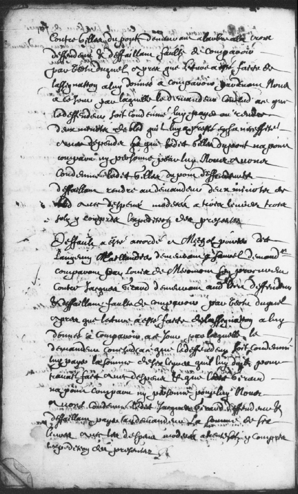 Défaut accordé à Michel Poirier dit Langevin, taillandier, demeurant à Sorel, demandeur, comparant par Louis Demeromont, son procureur, contre Jacques Girard, demeurant audit lieu, défendeur, pour la somme de 6 livres, pour du travail fait, lequel a fait défaut, ordonné que, de par son défaut, ledit defendeur soit condamné à payer audit demandeur la somme de 6 livres, plus les dépens modérés à 30 sols