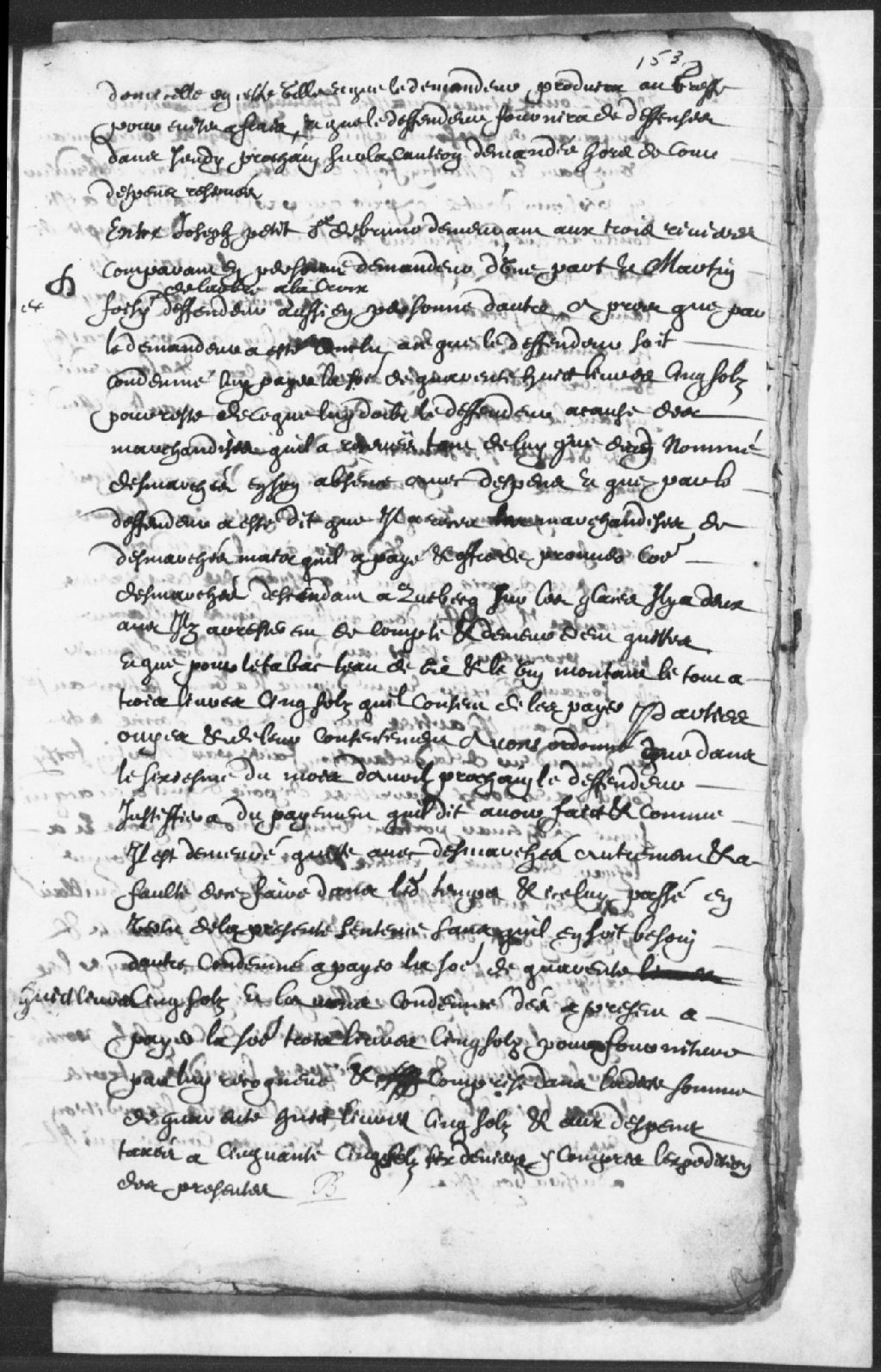 - Le titre complet de la pièce se lit comme suit : Requête de Joseph Petit sieur de Bruno (Bruneau), demeurant aux Trois-Rivières, demandeur, contre Martin Foisy, de l'Arbre-à-la-Croix, défendeur, pour la somme de 48 livres et 5 sols, reste de ce qu'il lui doit pour des marchandises reçues, tant de lui que d'un certain Desmarchés (Marchet - Desmarchais), lequel défendeur affirme avoir reçu des marchandises de Desmarchés il y a deux ans, de Québec, mais qu'ils ont arrêté compte et sont maintenant quittes, ce qu'il offre de prouver, et que pour le tabac, l'eau-de-vie et le vin (alcool), le tout montant à 3 livres et 5 sols, il consent de les payer, ordonné que ledit défendeur se justifiera du paiement qu'il dit avoir fait, le 6 avril 1680, sinon il est condamné à payer audit demandeur la somme de 48 livres et 5 sols, et doit dès maintenant s'acquitter de la somme de 3 livres et 5 sols, comprise dans ladite somme de 48 livres et 5 sols, plus [...]