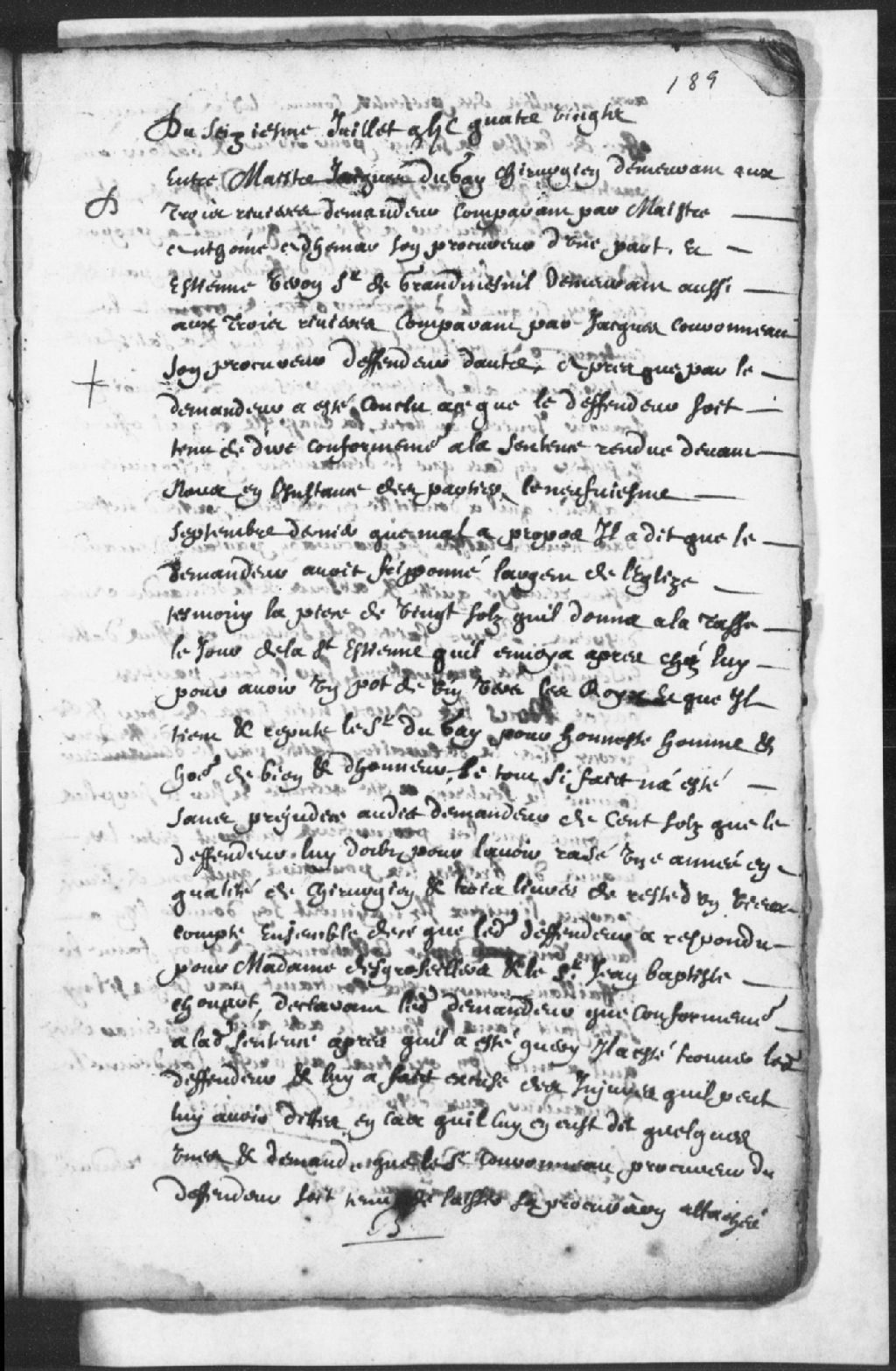 Requête de maître Jacques Dugay (Duguay), chirurgien, demandeur, comparant par maître Anthoine Adhémar, son procureur, contre Étienne Veron sieur de Grandmesnil (Grandménil), comparant par Jacques Couronneau, son procureur, défendeur..., 16 juillet 1680, Archives nationales à Trois-Rivières, Fonds Juridiction royale des Trois-Rivières, (04T,TL3,S11,P2169).